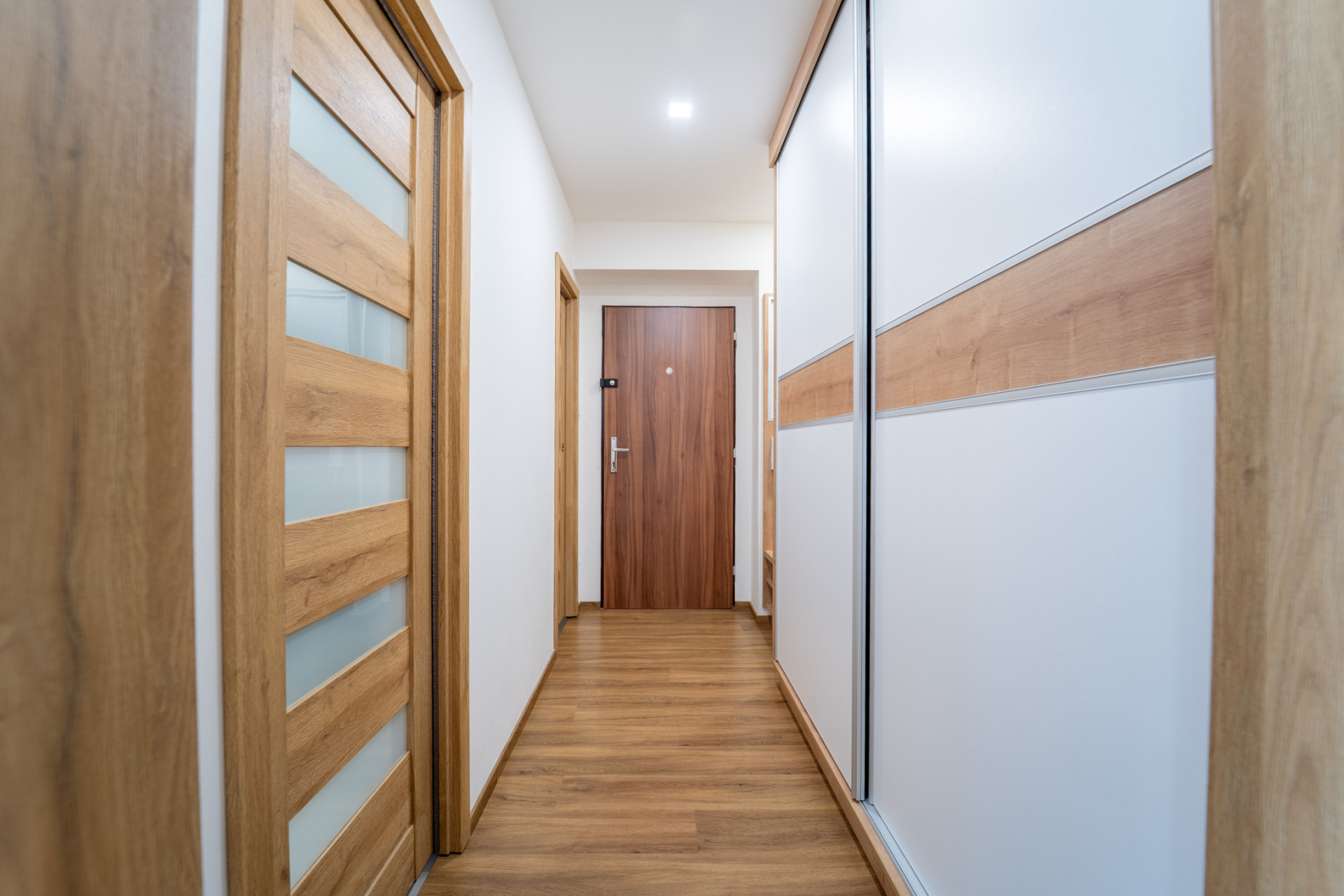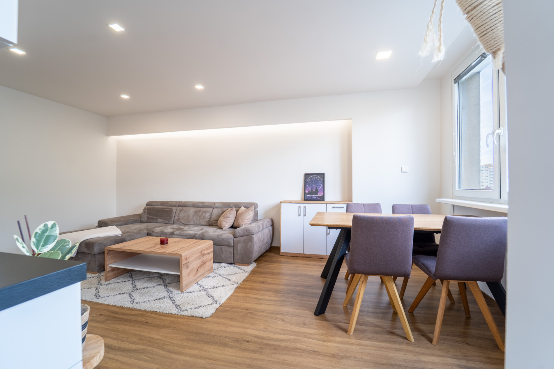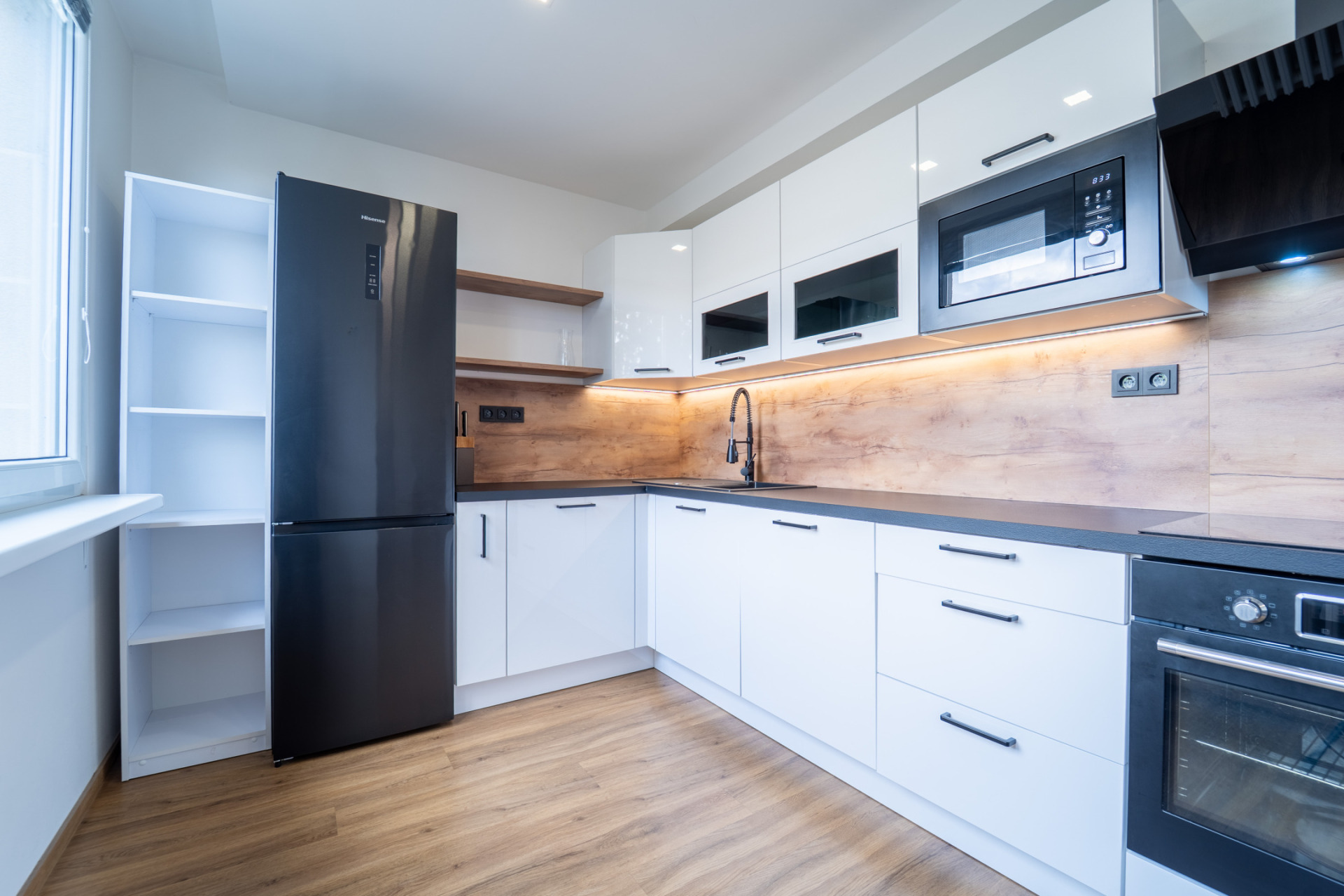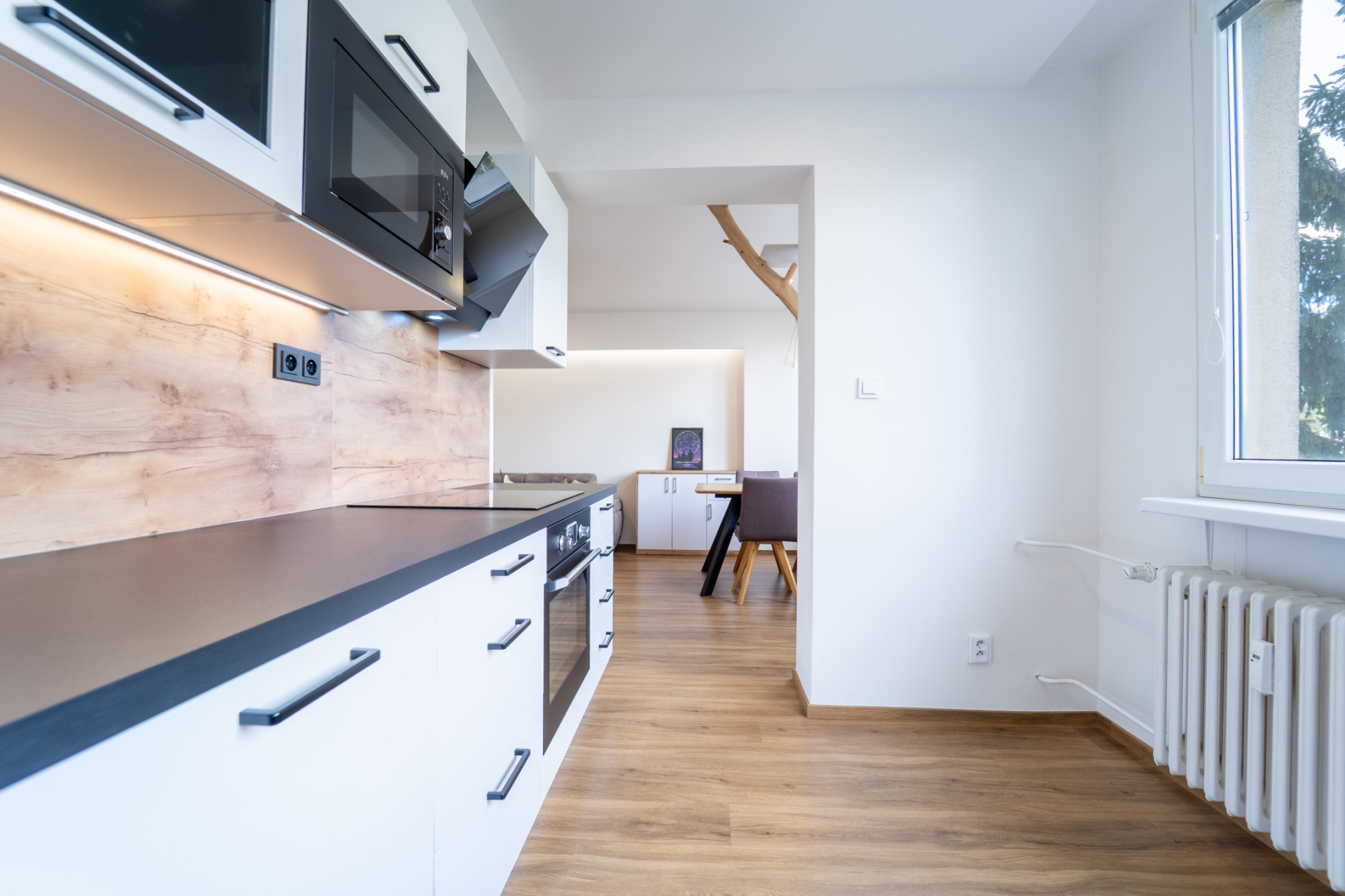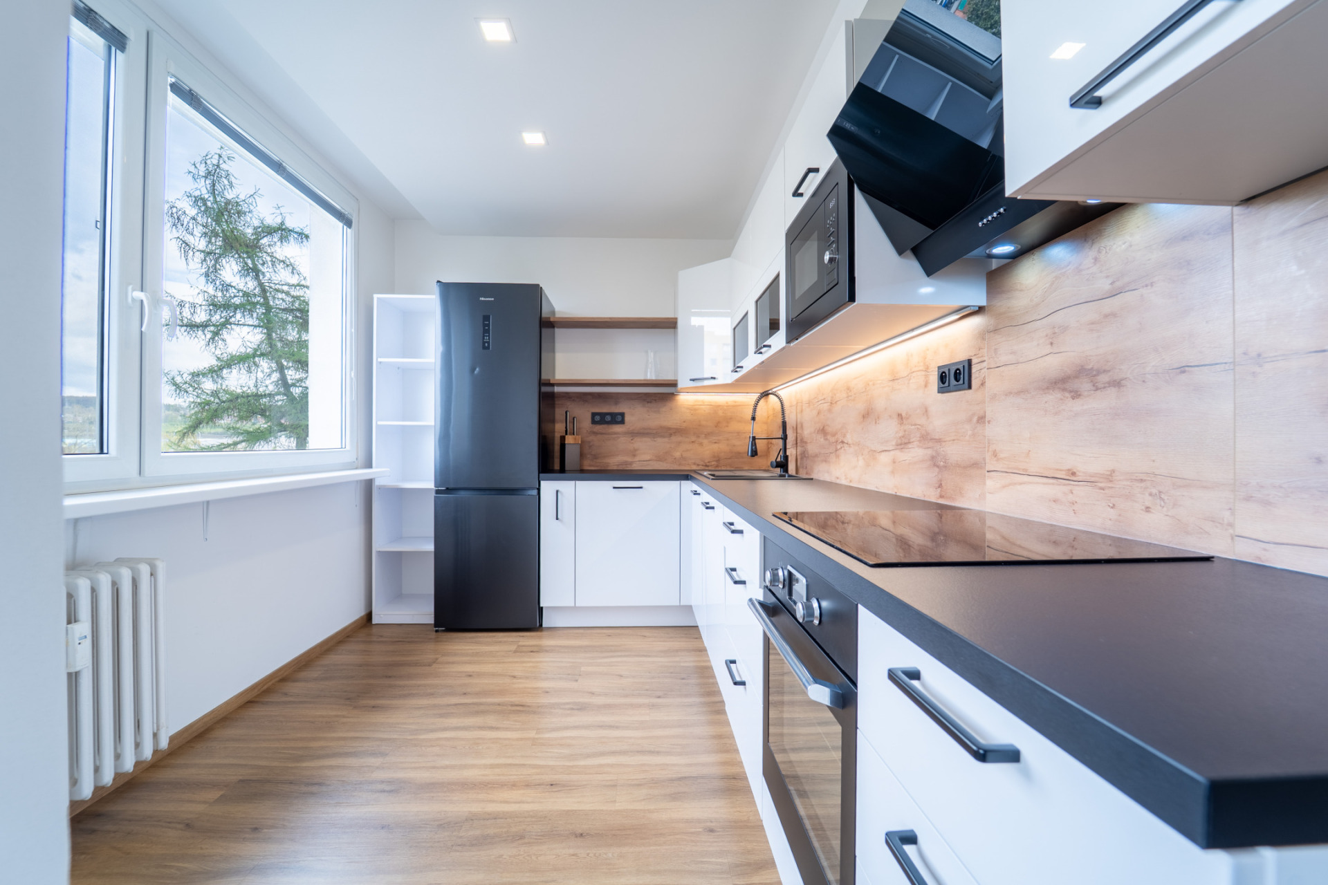 Byt prošel v roce 2021 kompletní rekonstrukcí (nové rozvody elektřiny, vody i odpadů, nové příčky, stropní podhledy s izolací). V obytných místnostech je jednotná vinylová podlaha, v předsíni praktické vestavěné úložné prostory s podsvícením. Kuchyňská linka je plně vybavena spotřebiči (lednice, trouba, indukční deska, myčka, mikrovlnná trouba). Z ložnice je vstup na zasklený balkon.