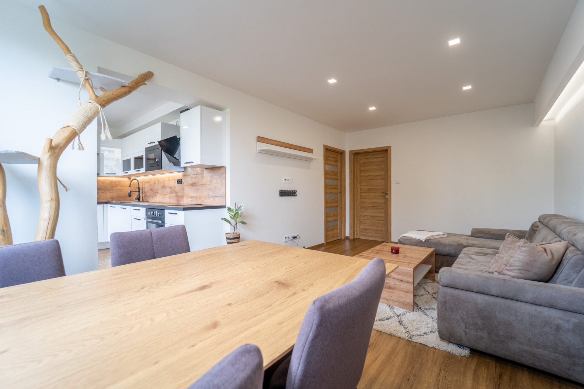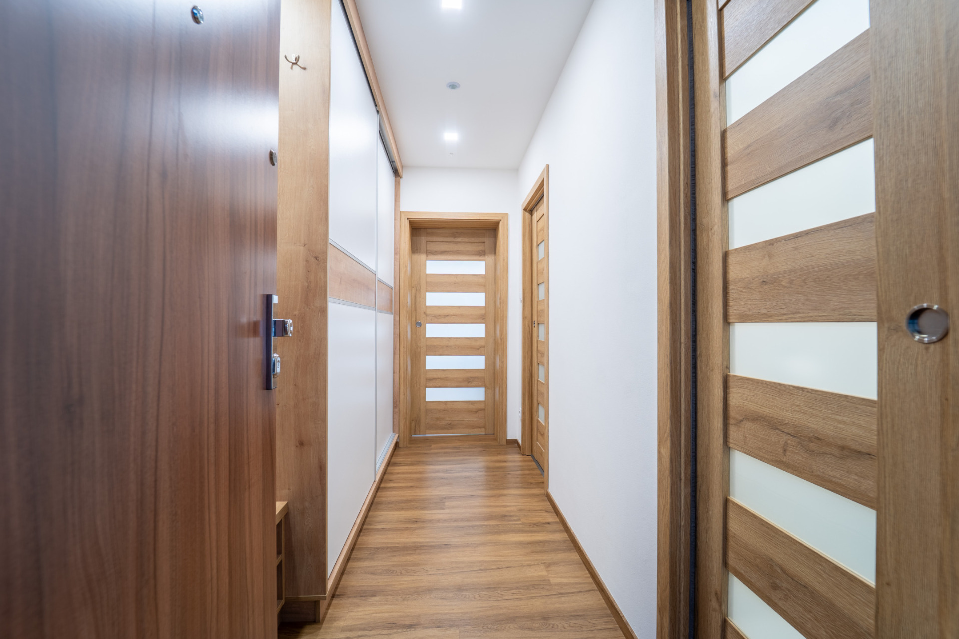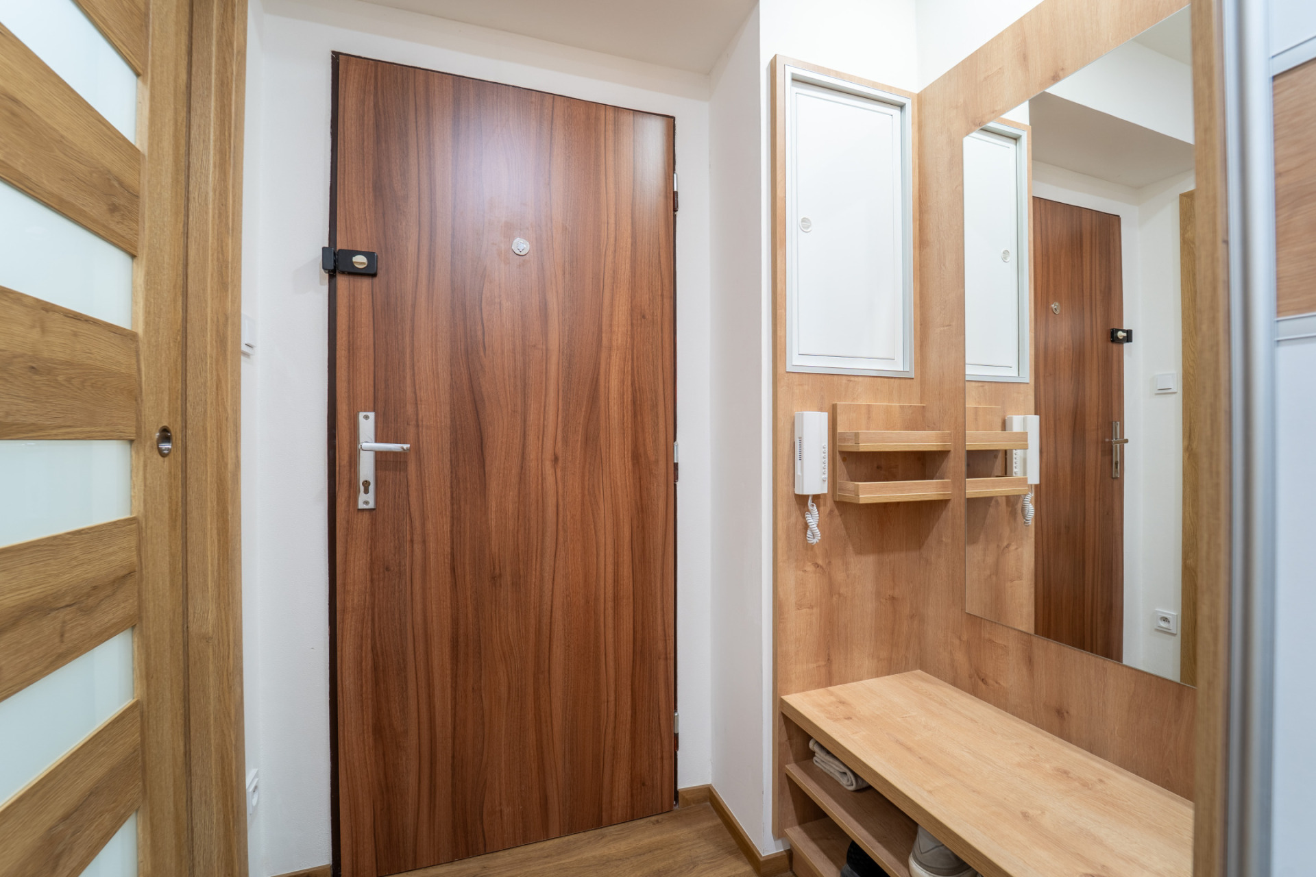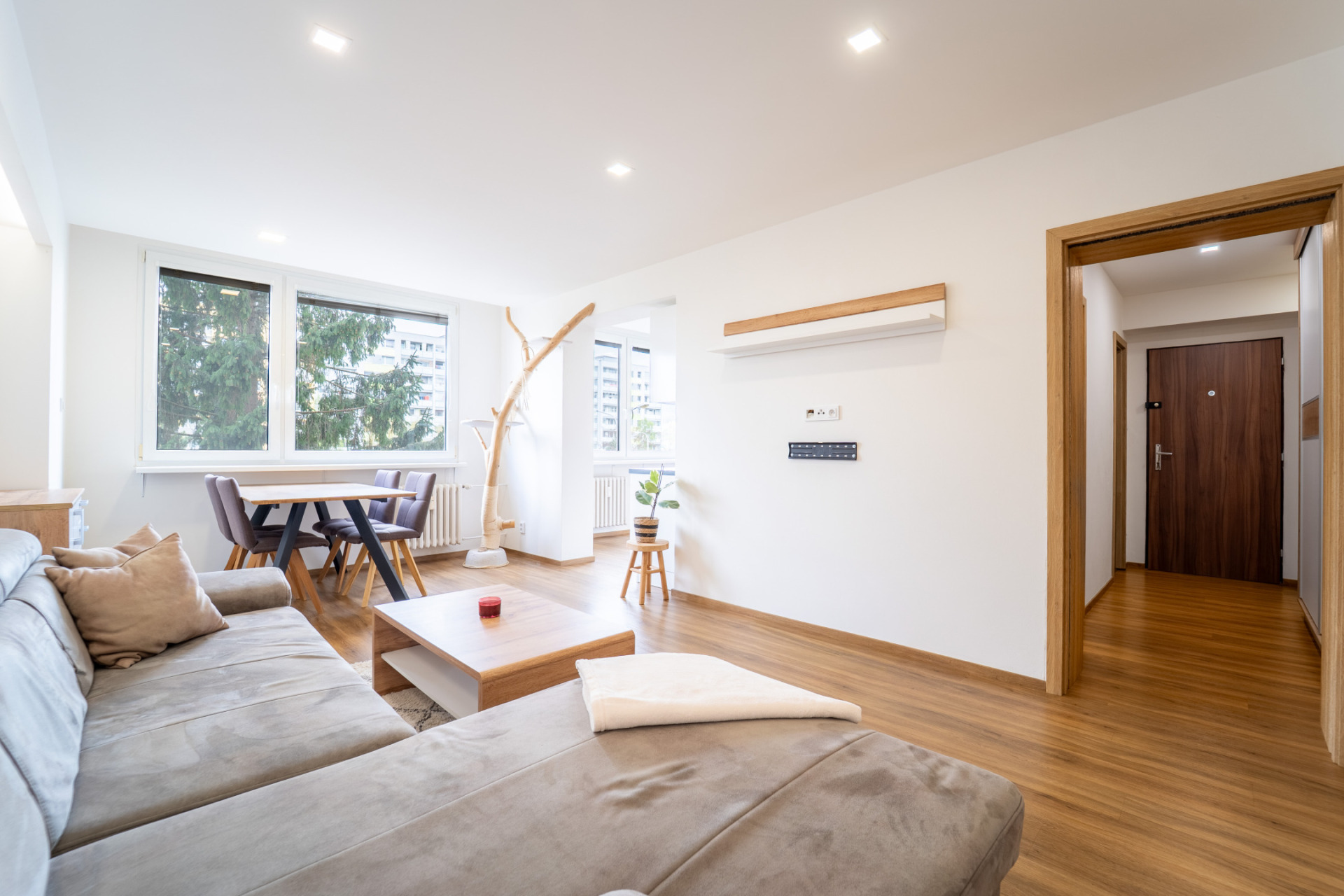Byt prošel v roce 2021 kompletní rekonstrukcí (nové rozvody elektřiny, vody i odpadů, nové příčky, stropní podhledy s izolací). V obytných místnostech je jednotná vinylová podlaha, v předsíni praktické vestavěné úložné prostory s podsvícením. Kuchyňská linka je plně vybavena spotřebiči (lednice, trouba, indukční deska, myčka, mikrovlnná trouba). Z ložnice je vstup na zasklený balkon.