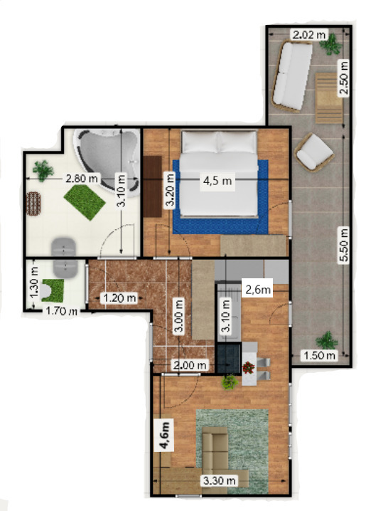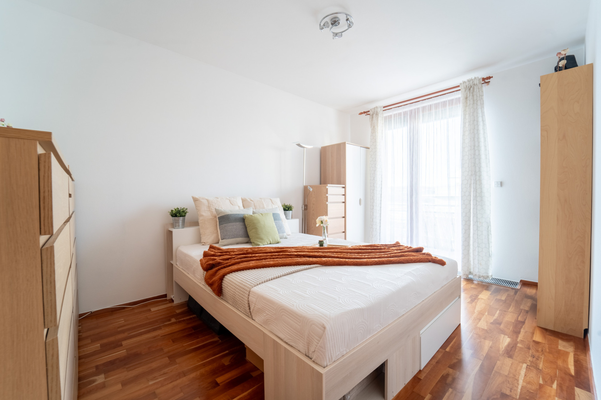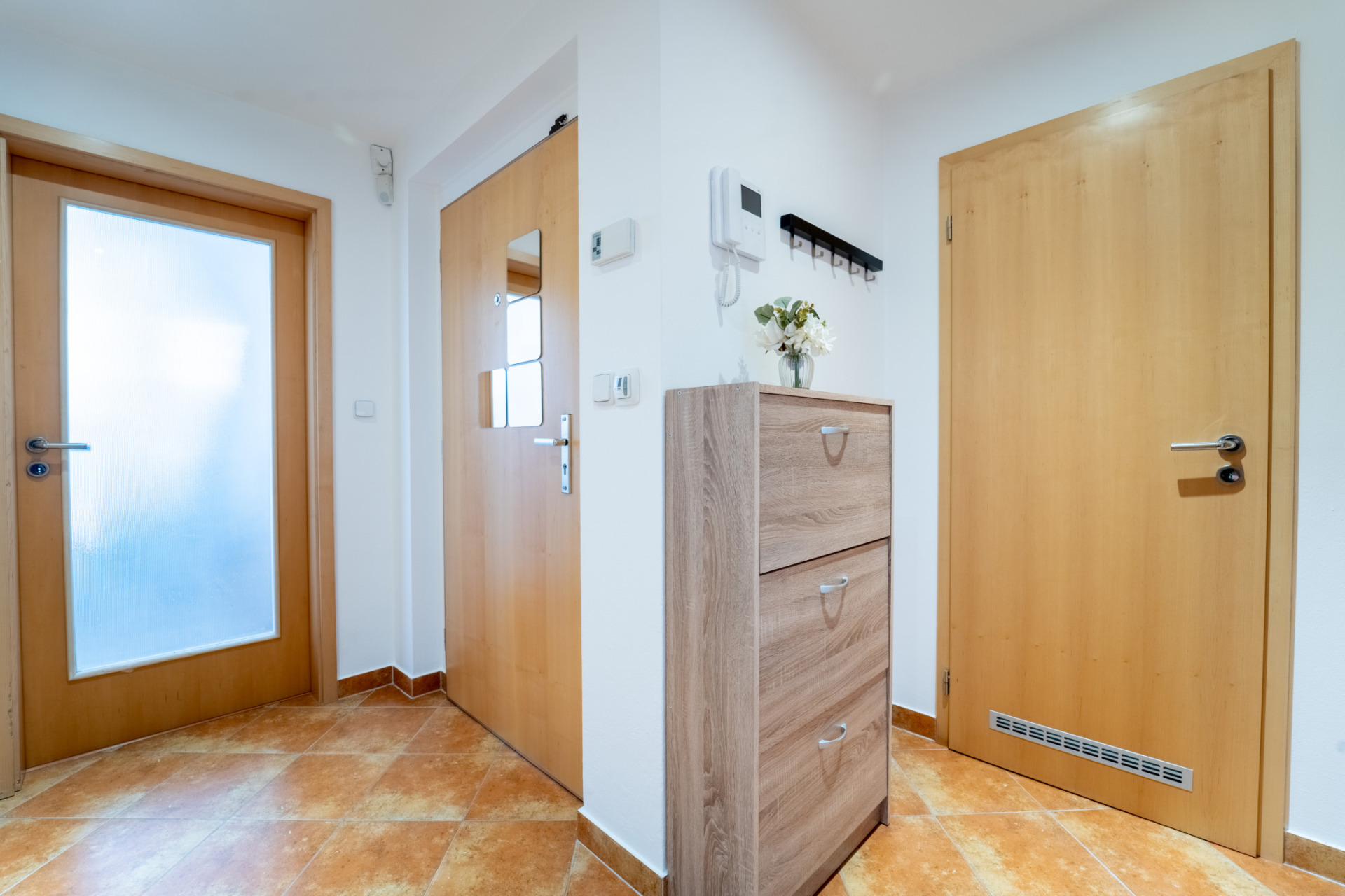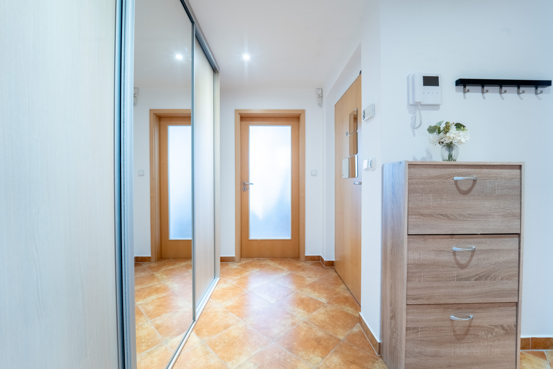 Samotný byt se pak skládá z prostorné chodby s úložnou skříní. Z chodby jsou přístupné všechny ostatní místnosti, tedy koupelna s vanou, samostatné wc, ložnice a obývací pokoj s kuchyňským koutem, terasa je pak přístupná z obou pokojů.