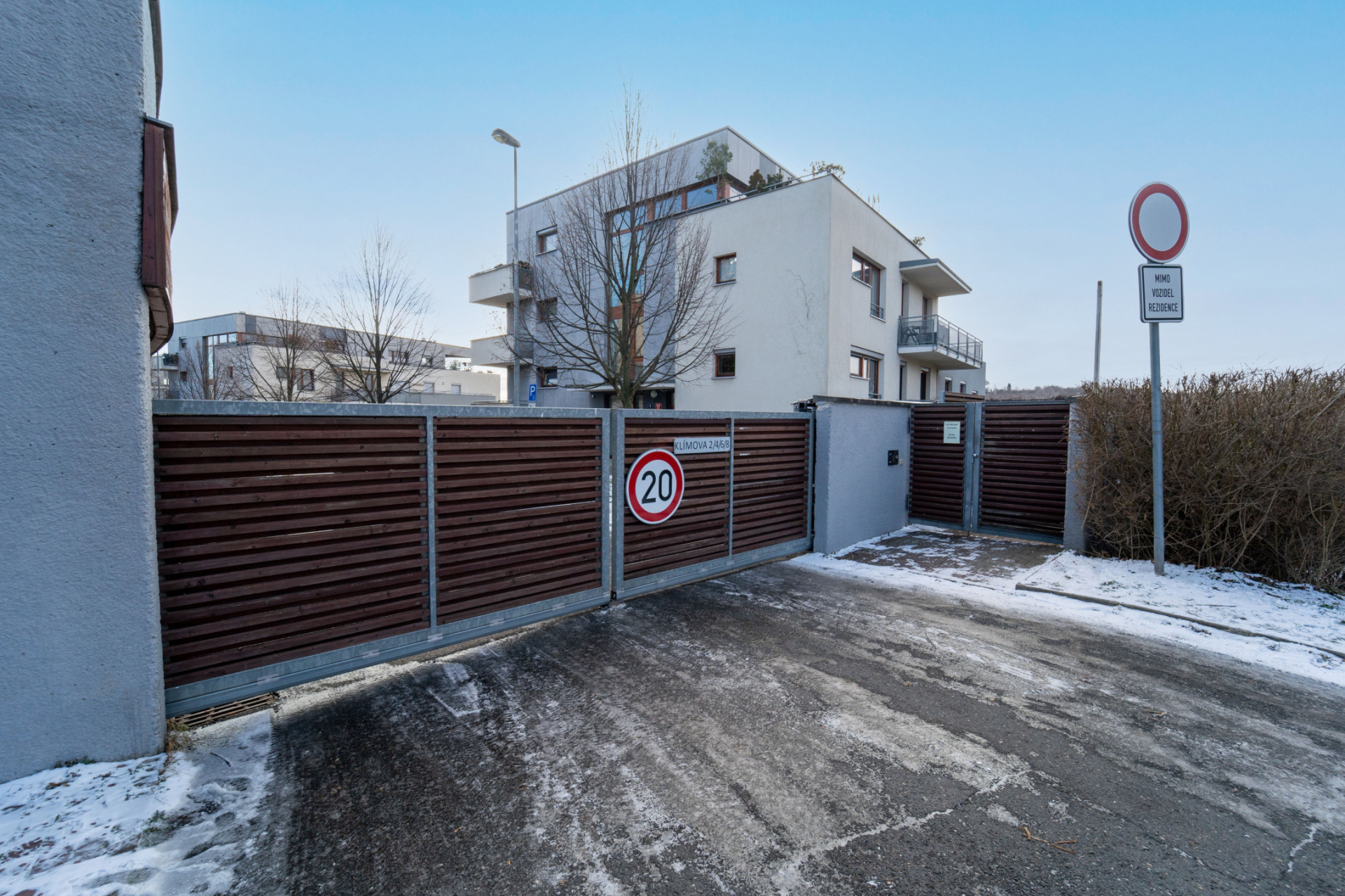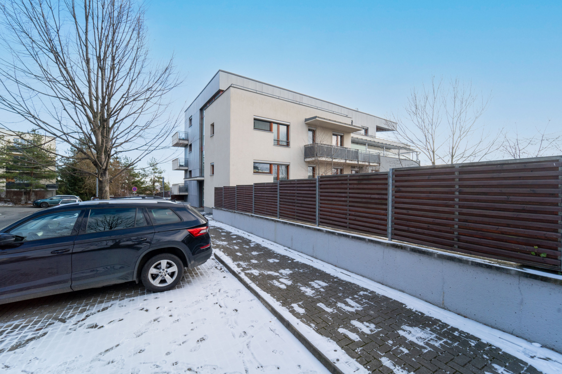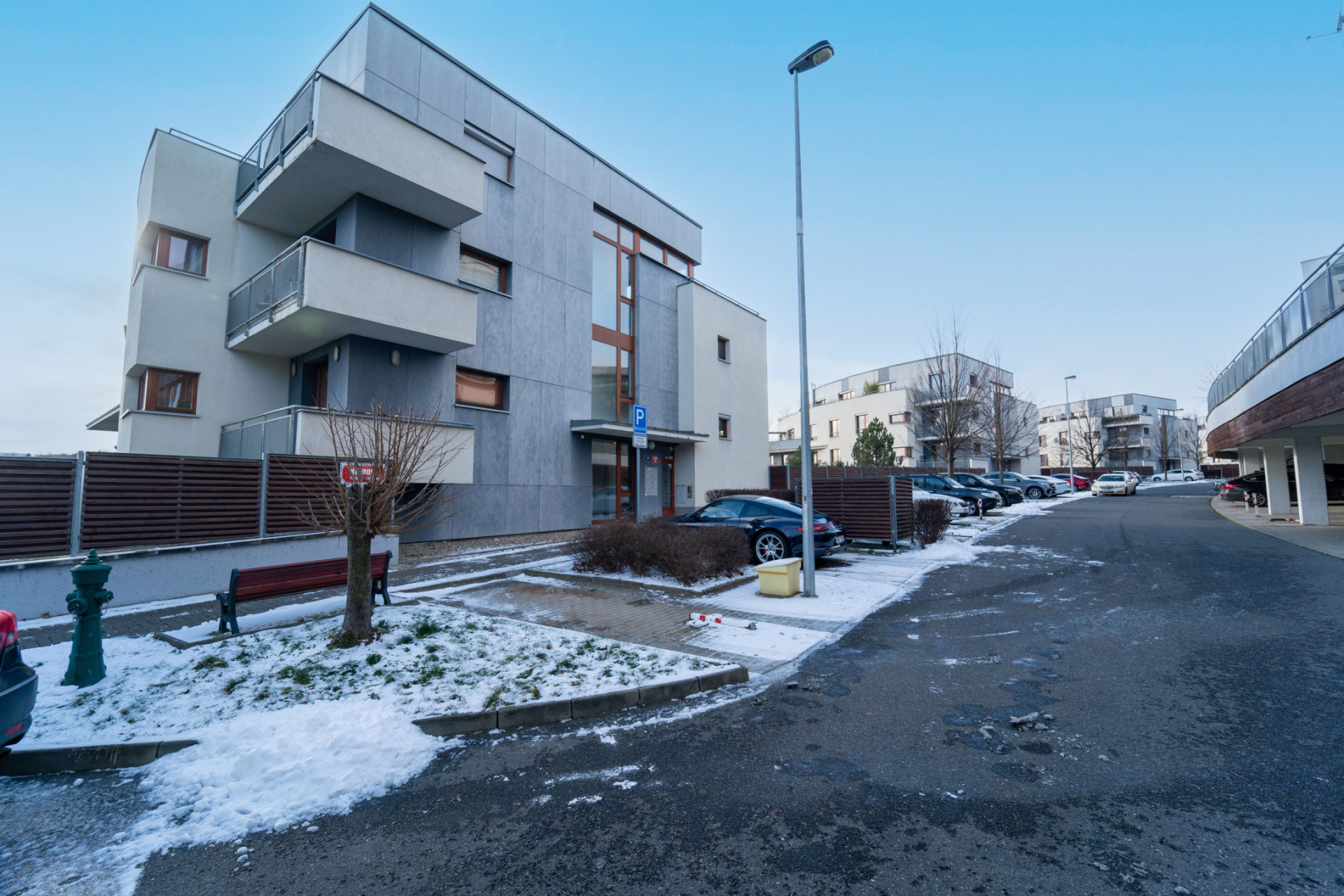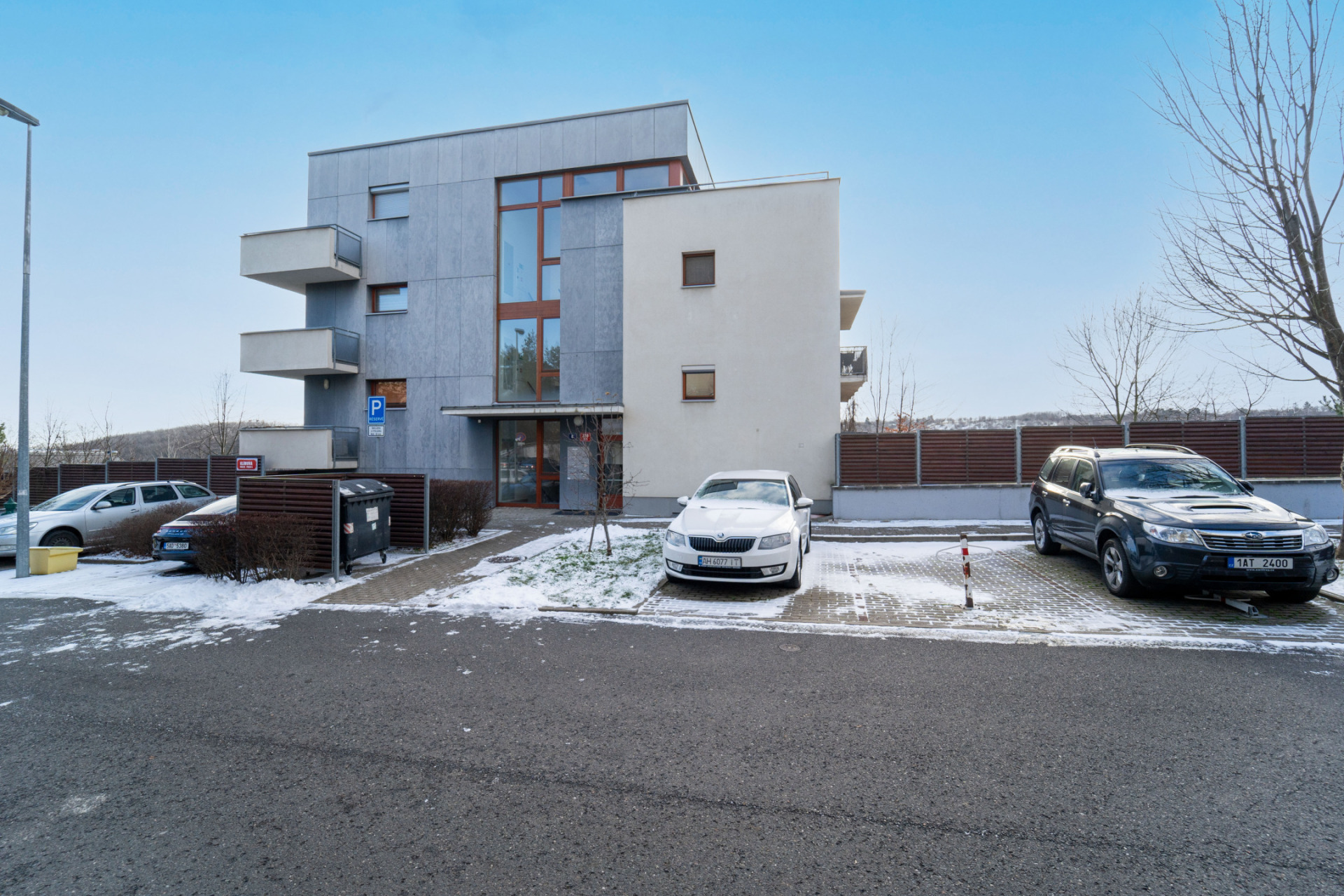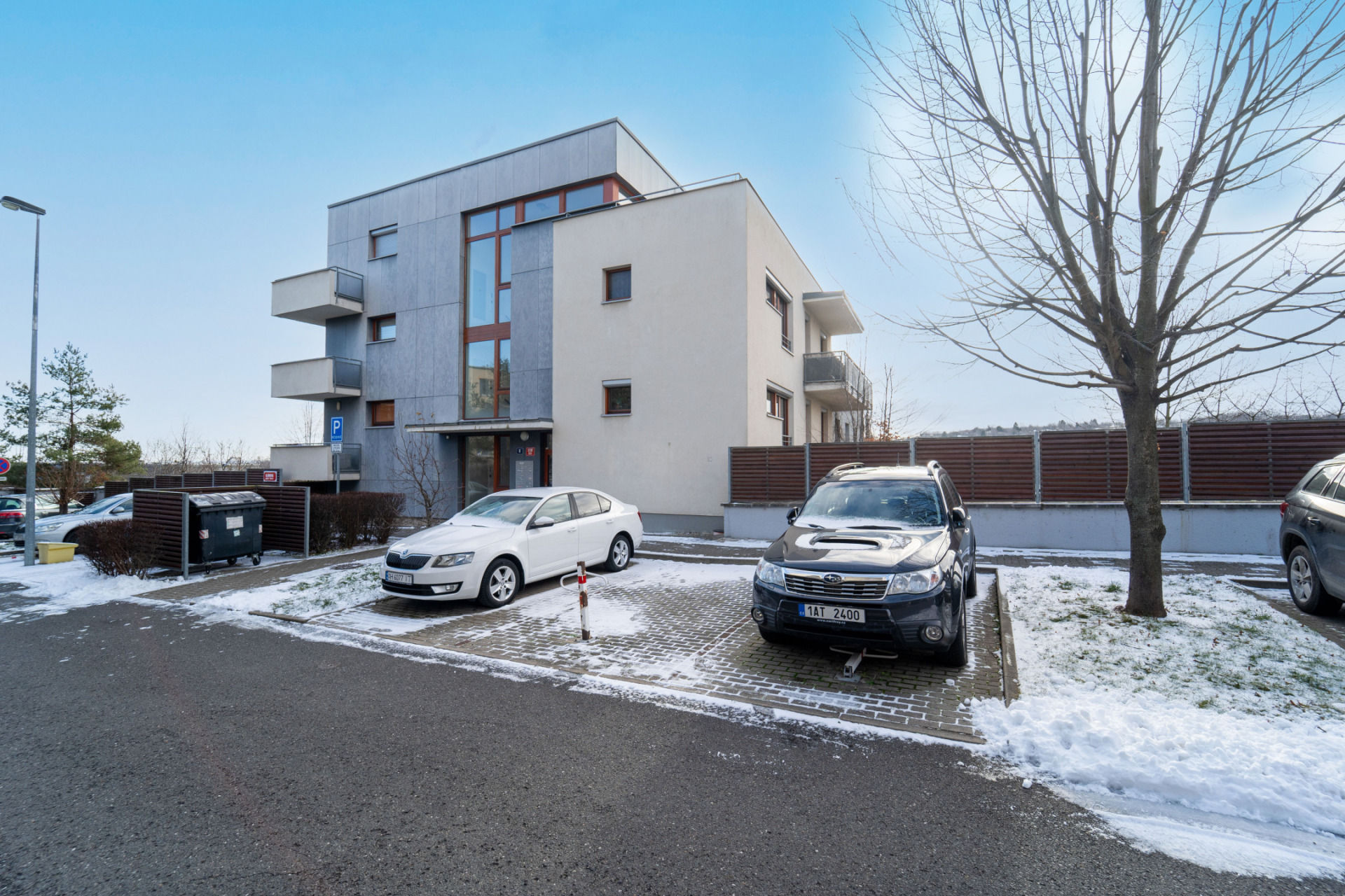 K bytu náleží vyhrazené venkovní parkovací stání a zděný sklep o velikosti 2,4 m2 umístěný v 2.PP, dále pak v domě k dispozici kočárkárna/kolárna a místnost s pinpongovým stolem pro volné využití všech rezidentů.