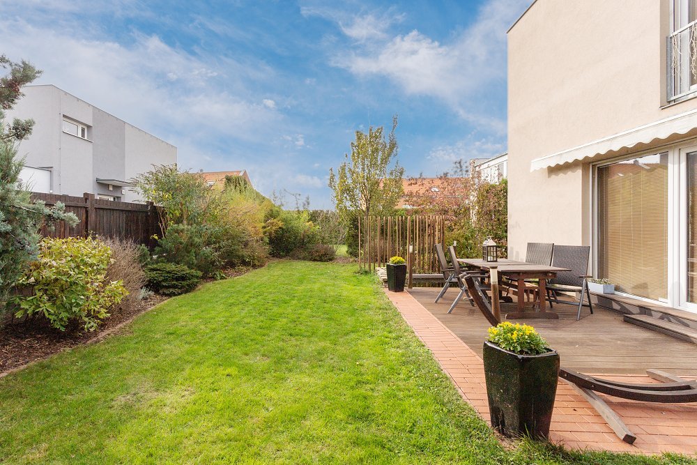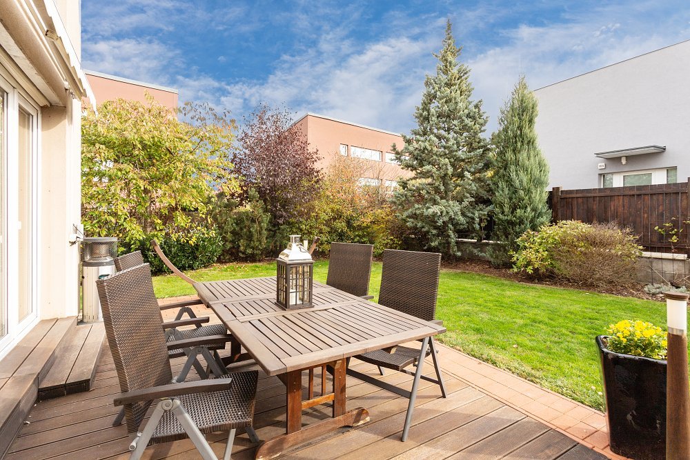 Odpočinek a útěk před každodenním stresem naleznete na zahradě obklopené vzrostlými dřevinami, které poskytují dostatek soukromí a oddělují prostor od okolní zástavby. K lenošení svádí dvě samostatné terasy (20 m2 a 10 m2) obložené exotickým dřevem. Na hlavní terase můžete při západu slunce pozorovat japonské rybky v zahradním jezírku.