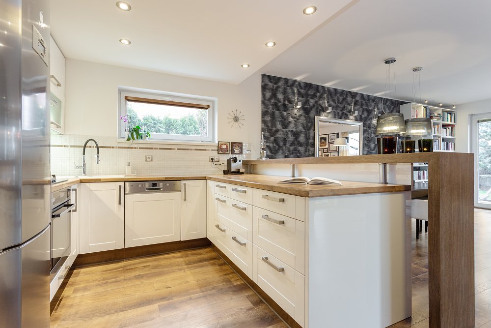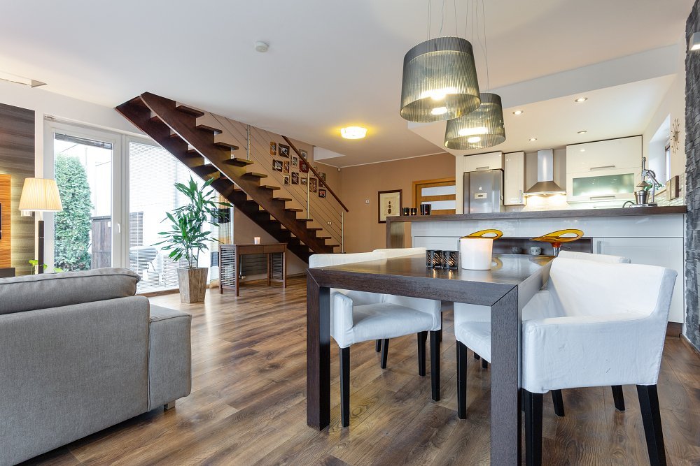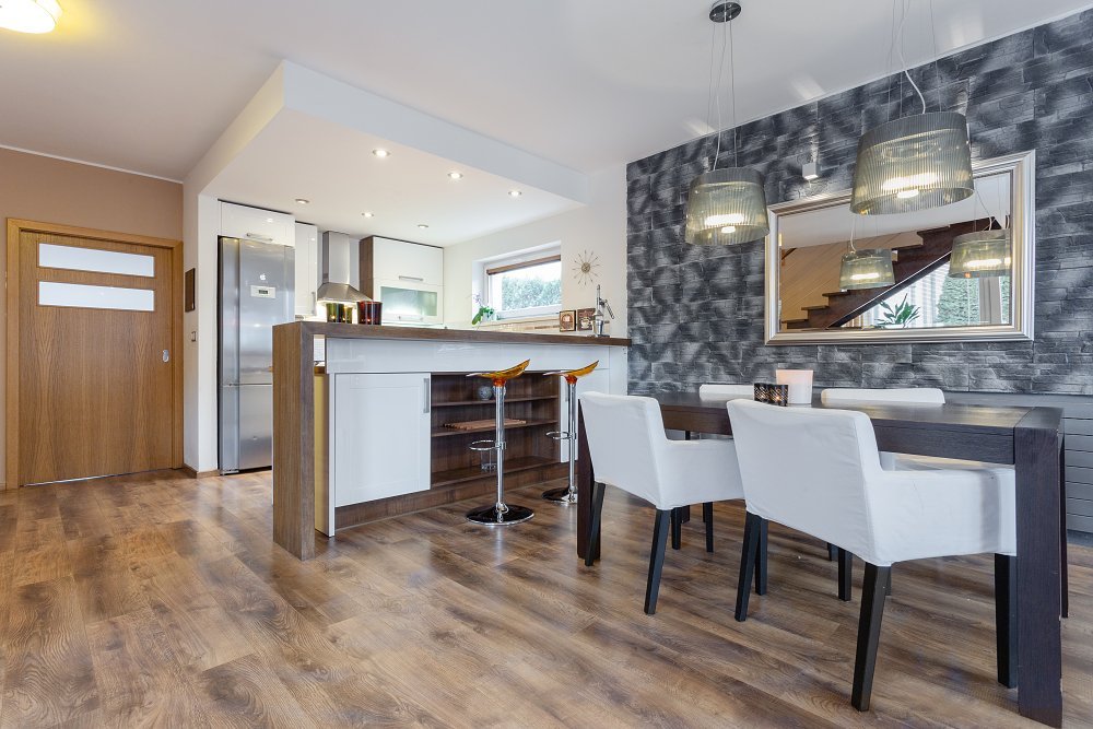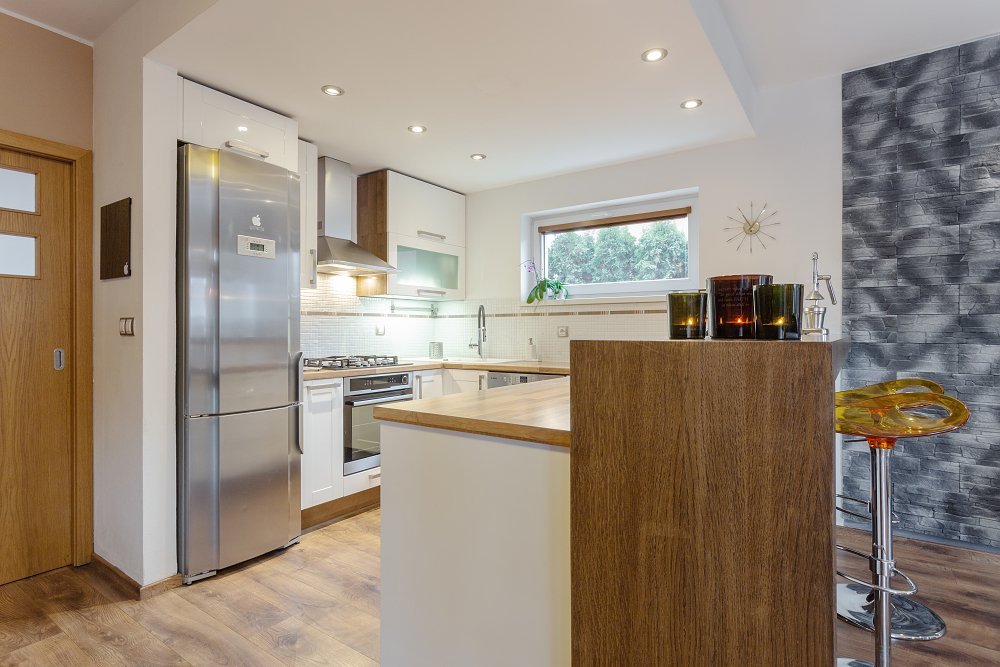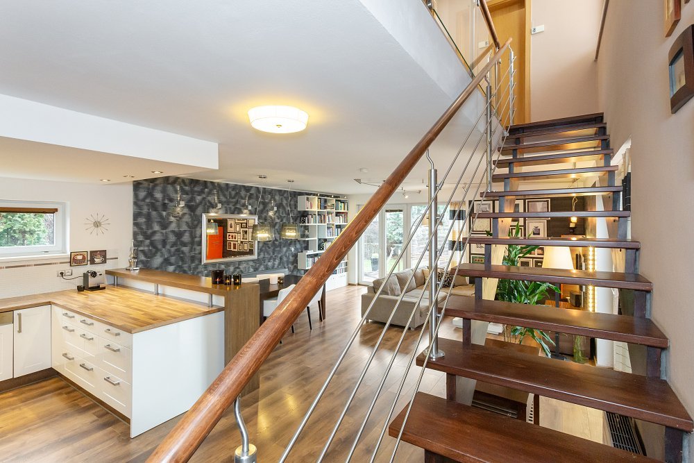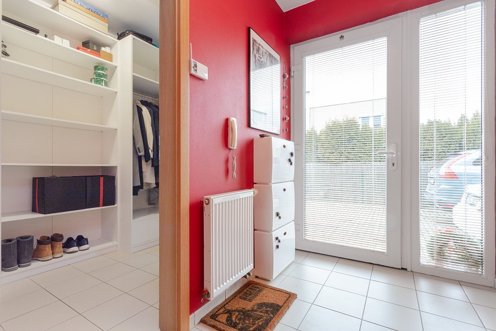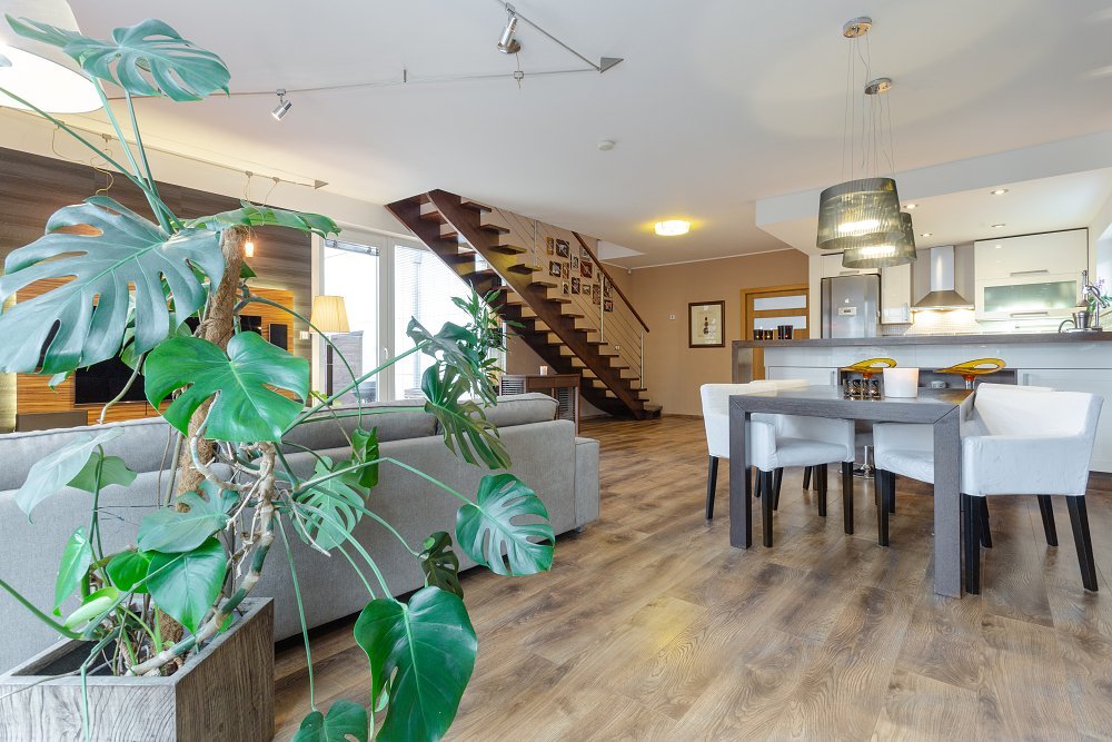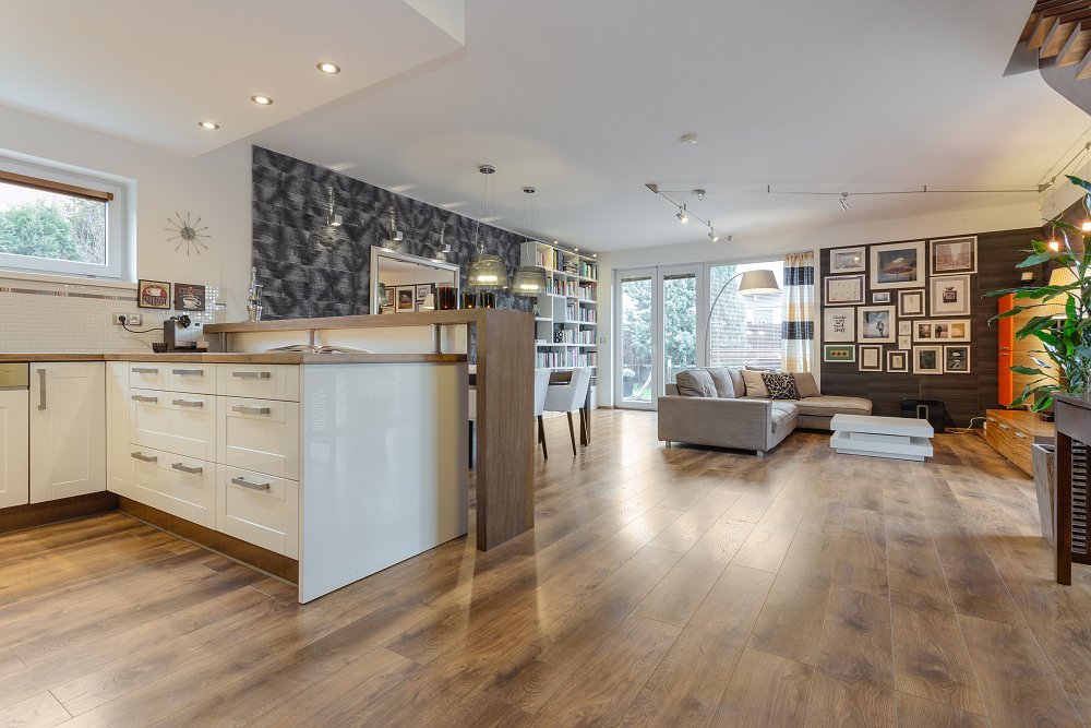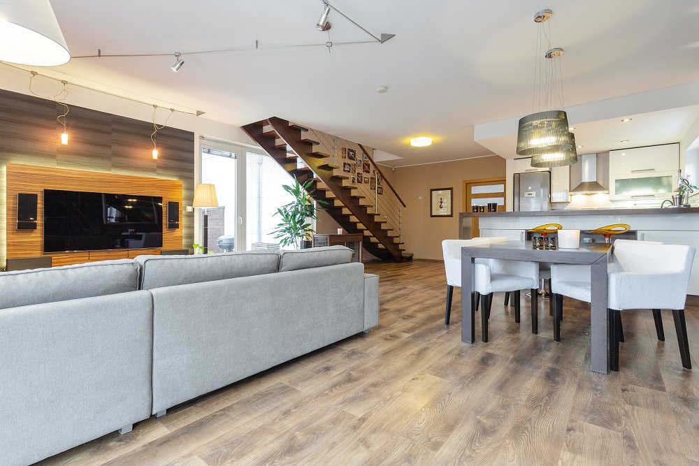 Při vstupu si můžete odložit v prostorné šatně (6m2) a po pár krocích vás osloví dominanta přízemí - vzdušný obývací pokoj (50m2) s moderní kuchyňskou linkou, vestavěnými spotřebiči a s dvěma samostatnými vstupy na zahradu.
