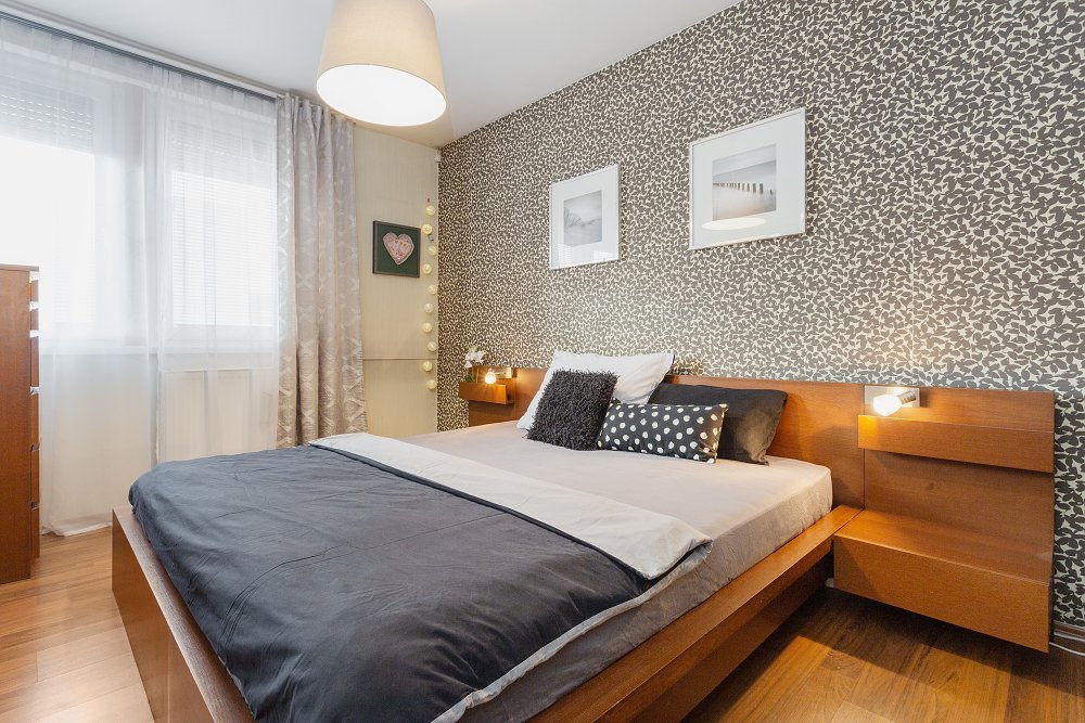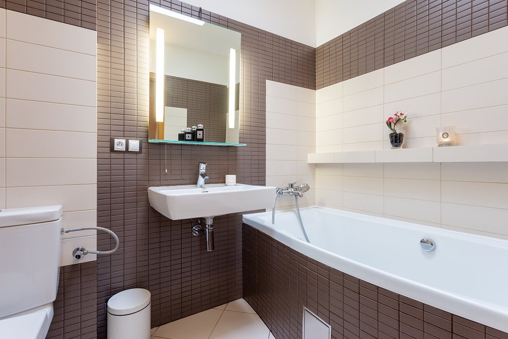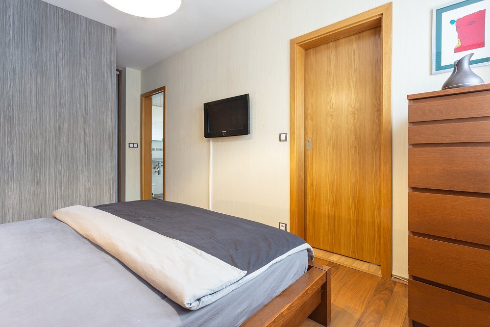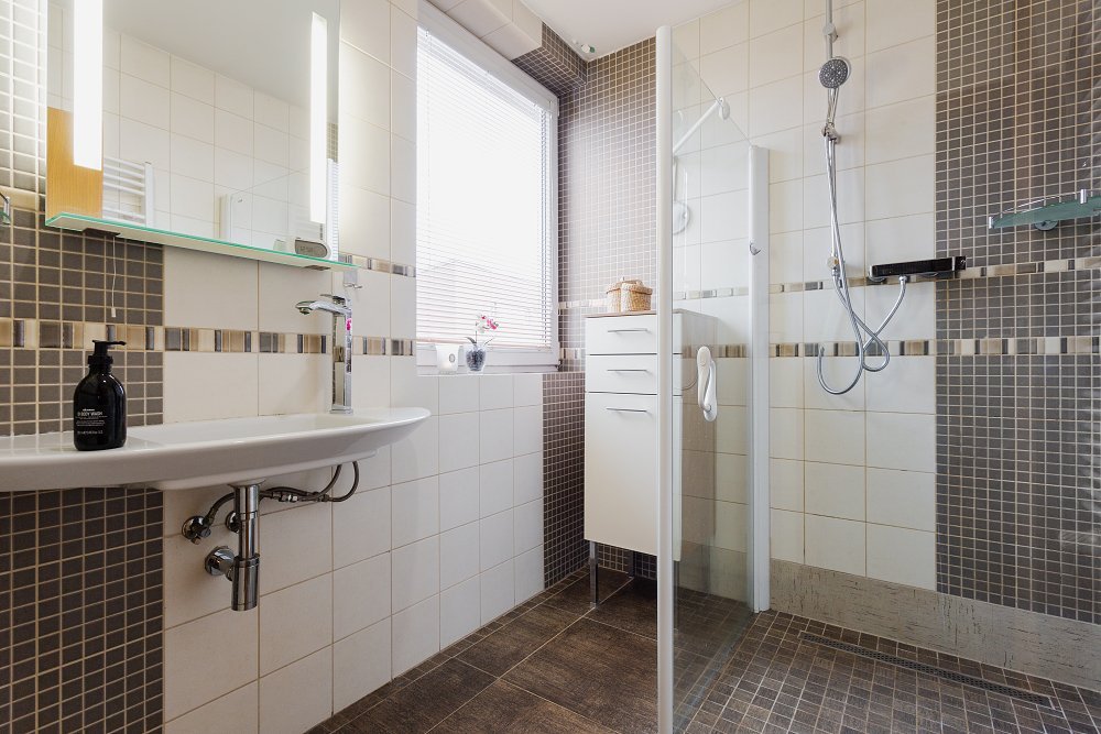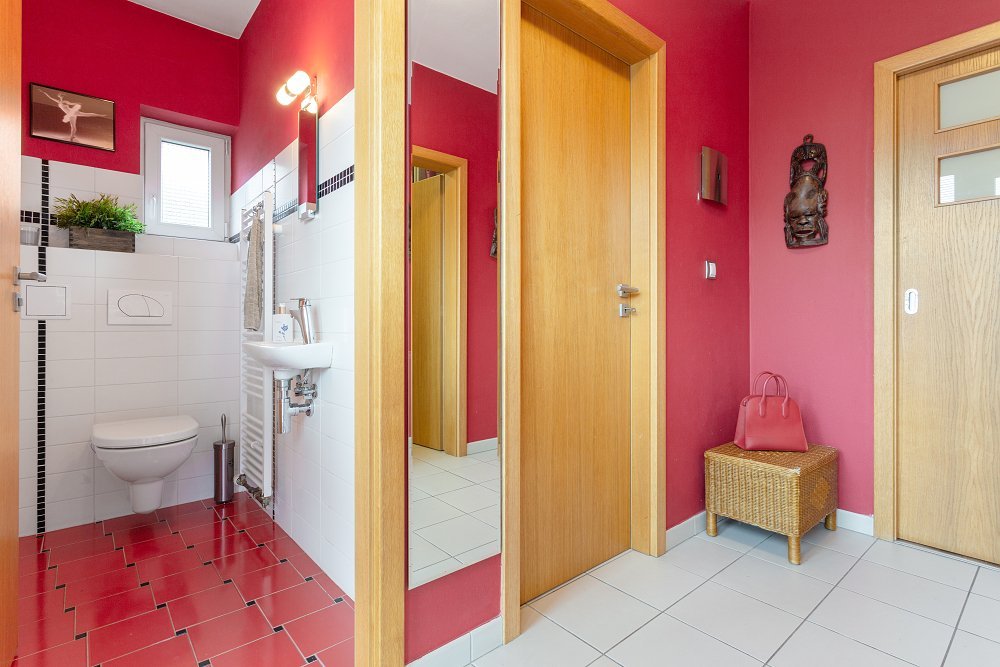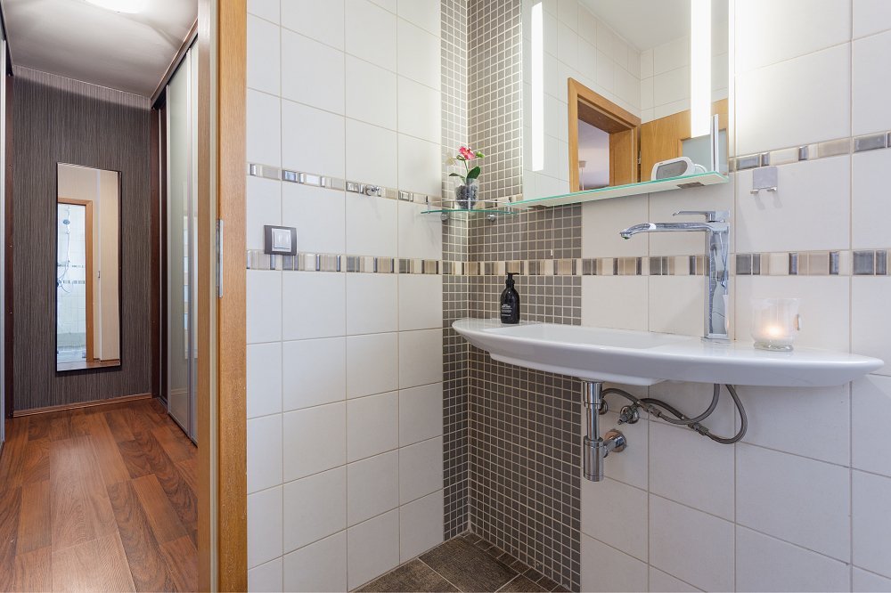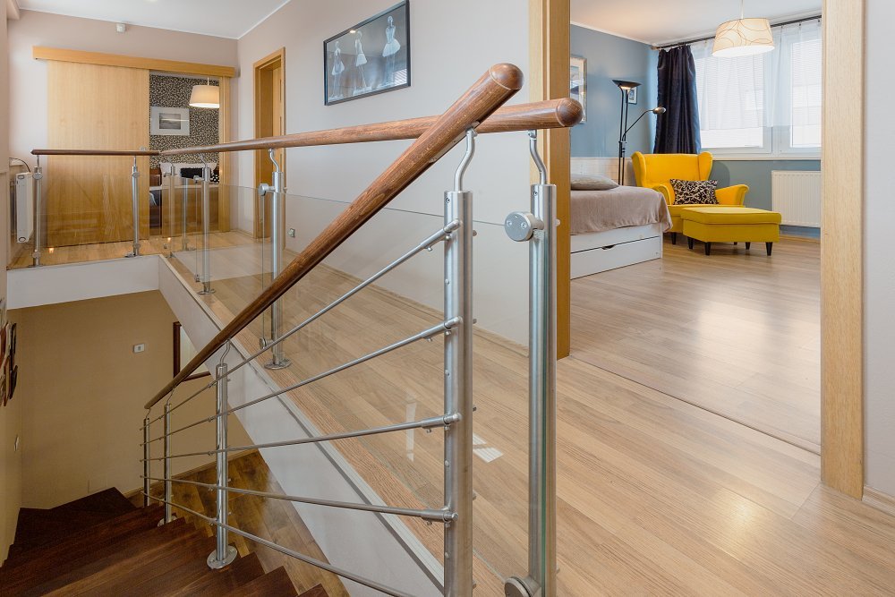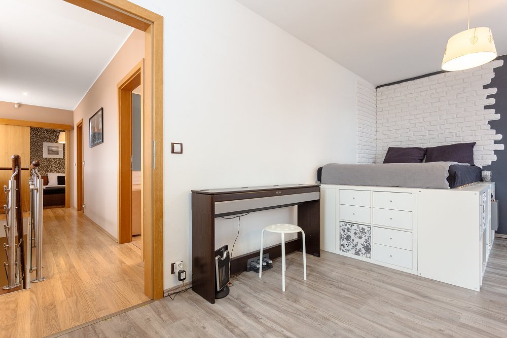 Do prvního patra se dostanete po designovém schodišti v kombinaci dřeva a kovových materiálů. Zde vás osloví hlavní ložnice (16,2m2), ve které nechybí oddělená prostorná šatna a samostatná koupelna se sprchovým koutem. Další dva pokoje o velikosti 16,6m2 a 12m2 mají k dispozici druhou koupelnu s vanou a toaletou.