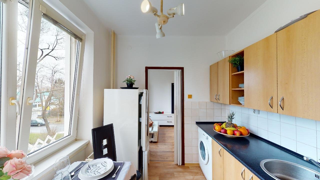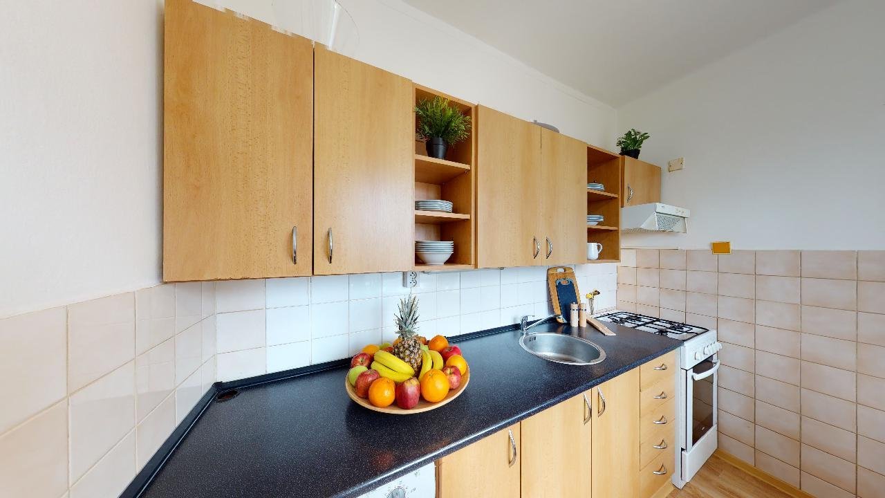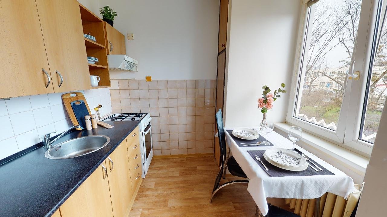 Byt se nabízí částečně vybavený: kuchyňská linka s elektrickou troubou a plynovým sporákem, pračka, jídelní stolek, dvě židle, obývací stěna s vitrínou a konferenční stolek, vestavěná šatní skříň v ložnici a vestavěná skříň v předsíni (ostatní vybavení je pouze prezentační). Dle dohody