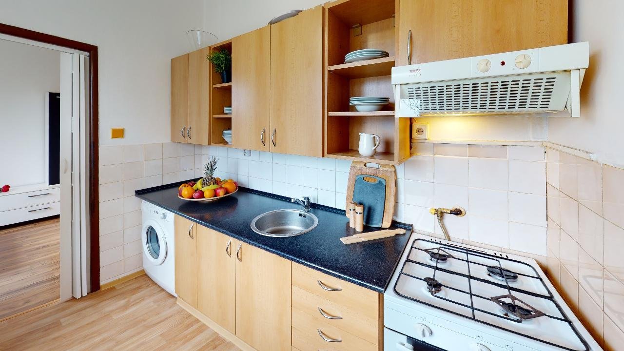 Kuchyňská linka, elektrická trouba s plynovým sporákem, pračka, lednička, jídelní stůl + židle, skříně.