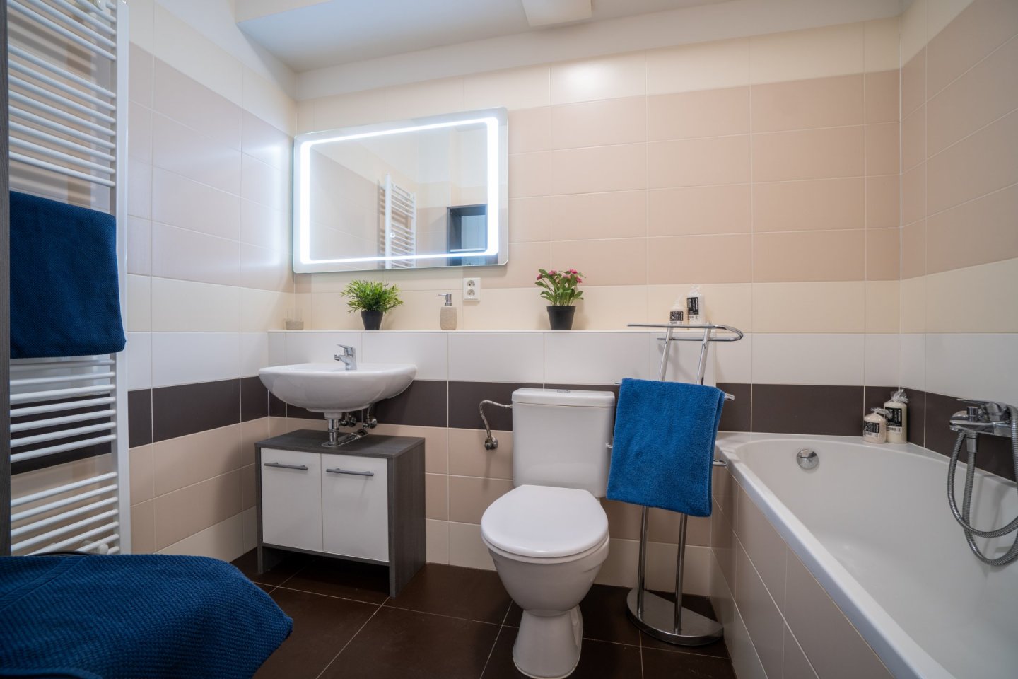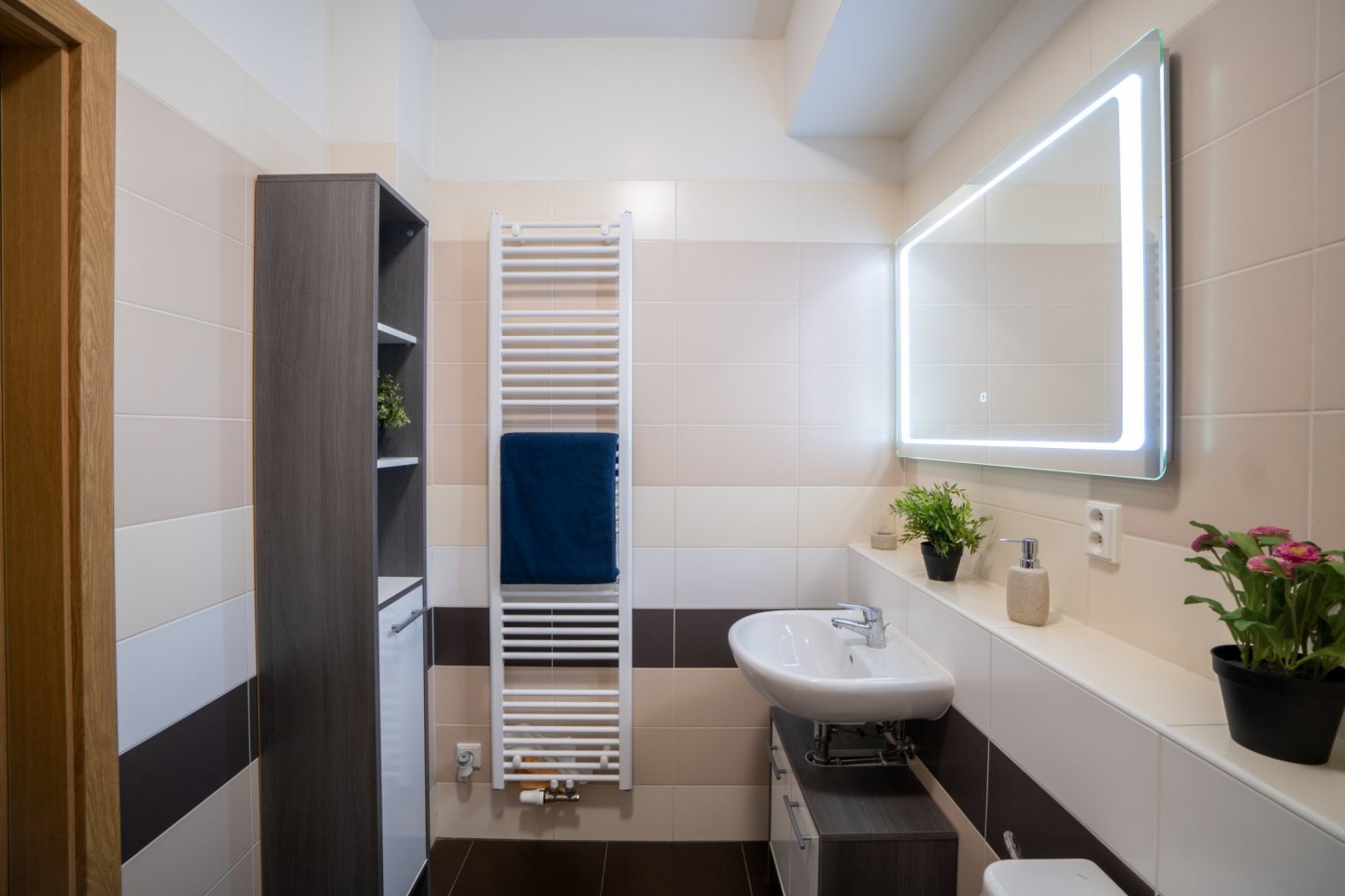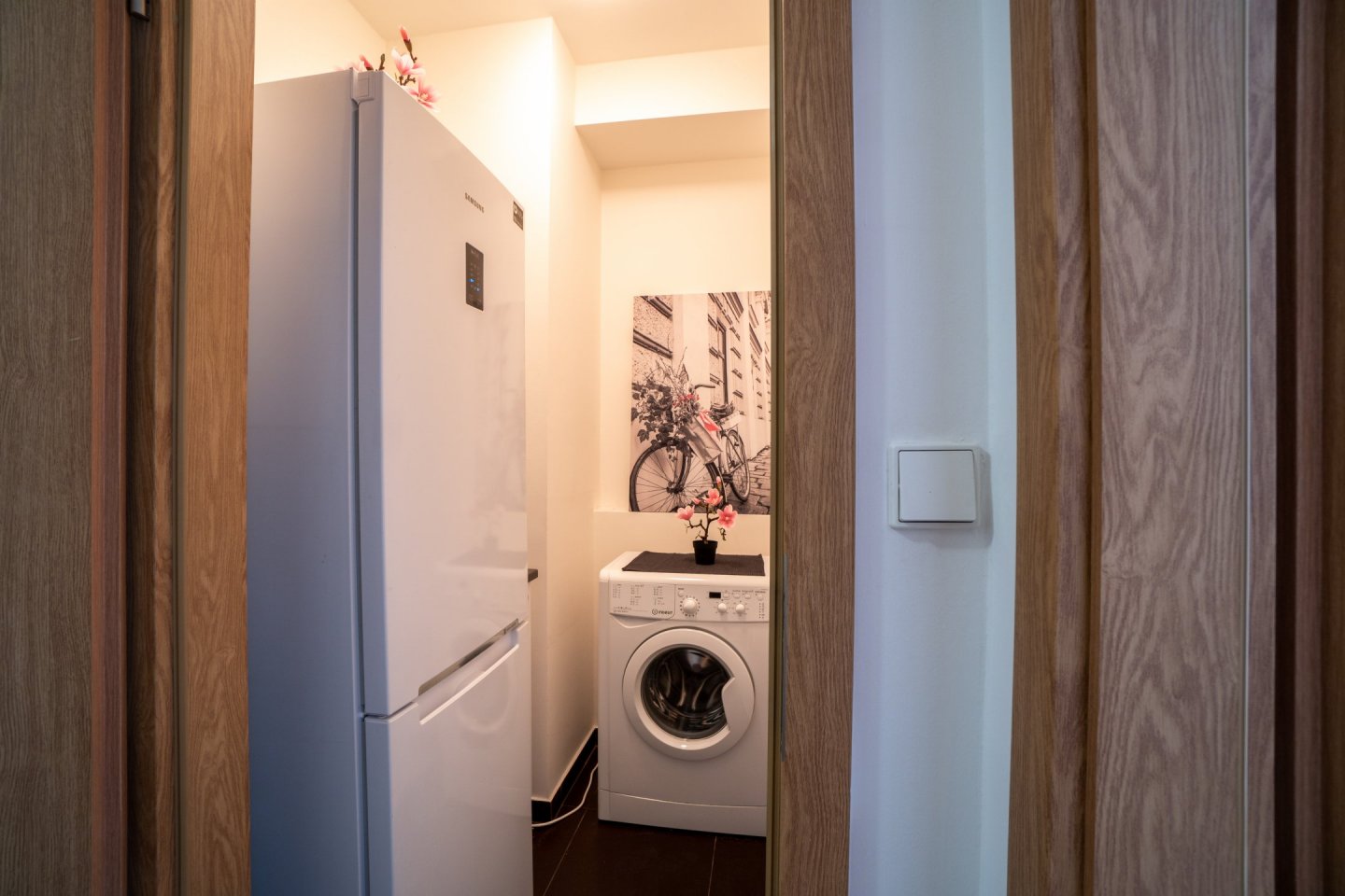 Byt je ideální pro jednu až dvě osoby a nachází se v přízemí novostavby s bezbariérovým přístupem. Předsíň vybavena velkou vestavěnou skříní s dostatečným úložným prostorem, včetně oddělené technické komory pro pračku (případně sušičku) a lednici, dále je z ní přístup do koupelny s vanou a WC. Podlahovou krytinu tvoří dlažba.