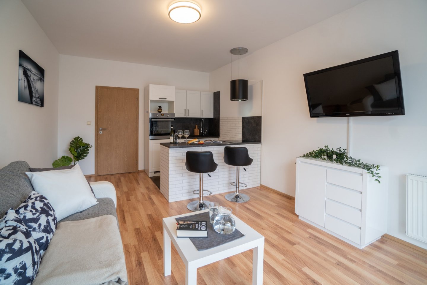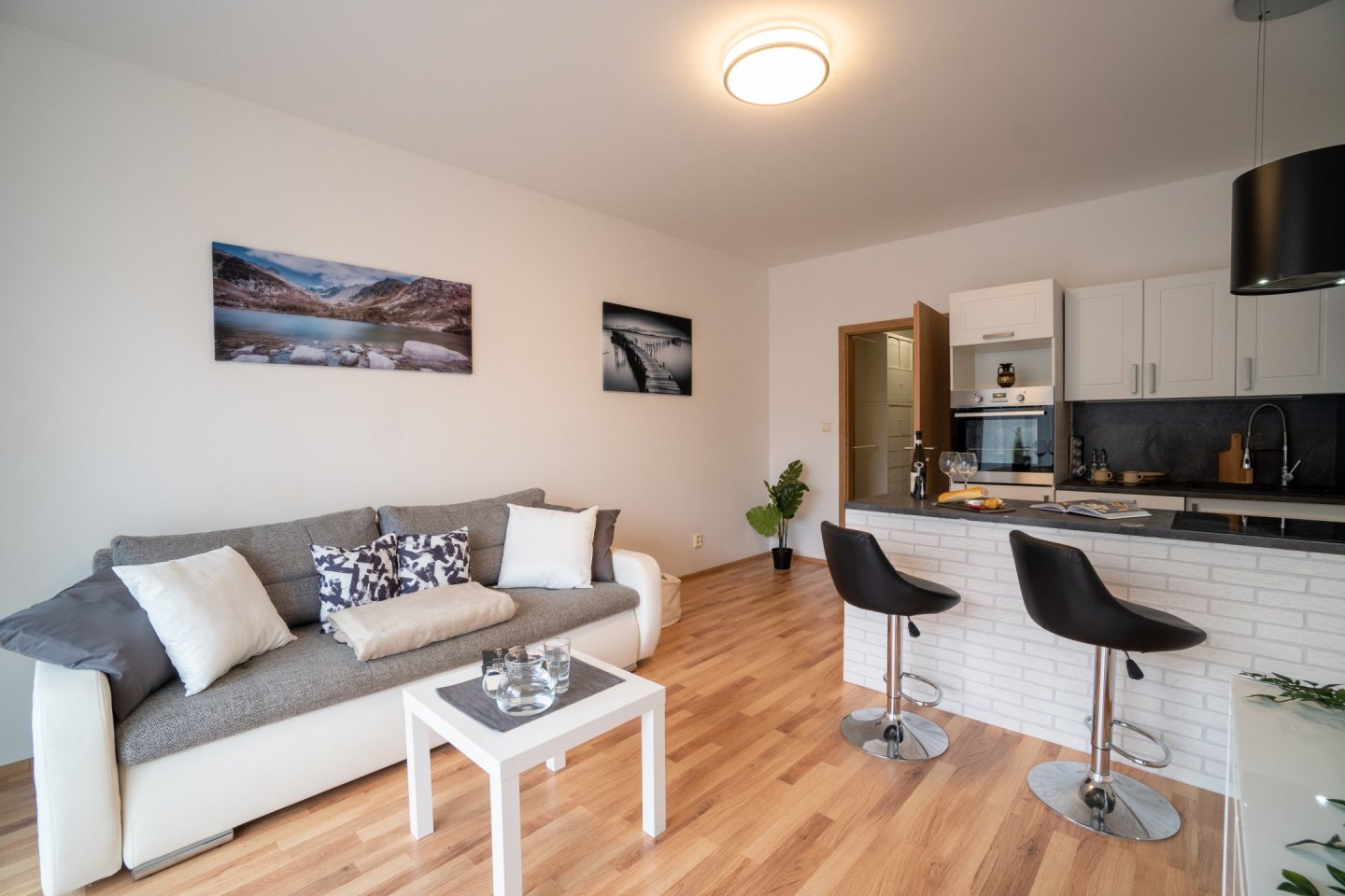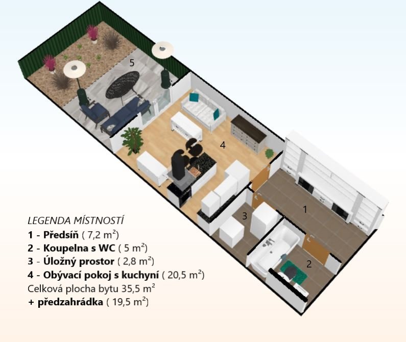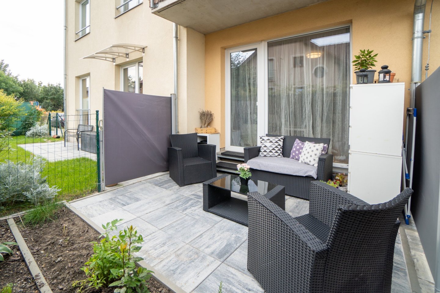 Obývací pokoj je spojený s kuchyňským koutem o celkové rozloze 20,5 m2, kuchyně je oddělena praktickým pultem s dvěma židlemi a možností využití jako jídelního stolu. V Kuchyni je pak myčka, horkovzdušná trouba, indukční varná deska se čtyřmi plotýnkami a digestoř. Podlahovou krytinu tvoří plovoucí podlaha. V obývacím pokoji rozkládací pohovka, komoda a TV, topení řešeno lokální ústředním kotelnou v domě. Z obývacího pokoje je přístup na menší zahrádku o velikosti cca 20 m2, která je vybavena zahradním nábytkem k příjemnému ničím nerušenému posezení až čtyř osob se stolkem a dvěma úložnými skříňkami. Plot s neprůhlednou plachtou pro zachování max. soukromí vůči klidné postranní uličce.