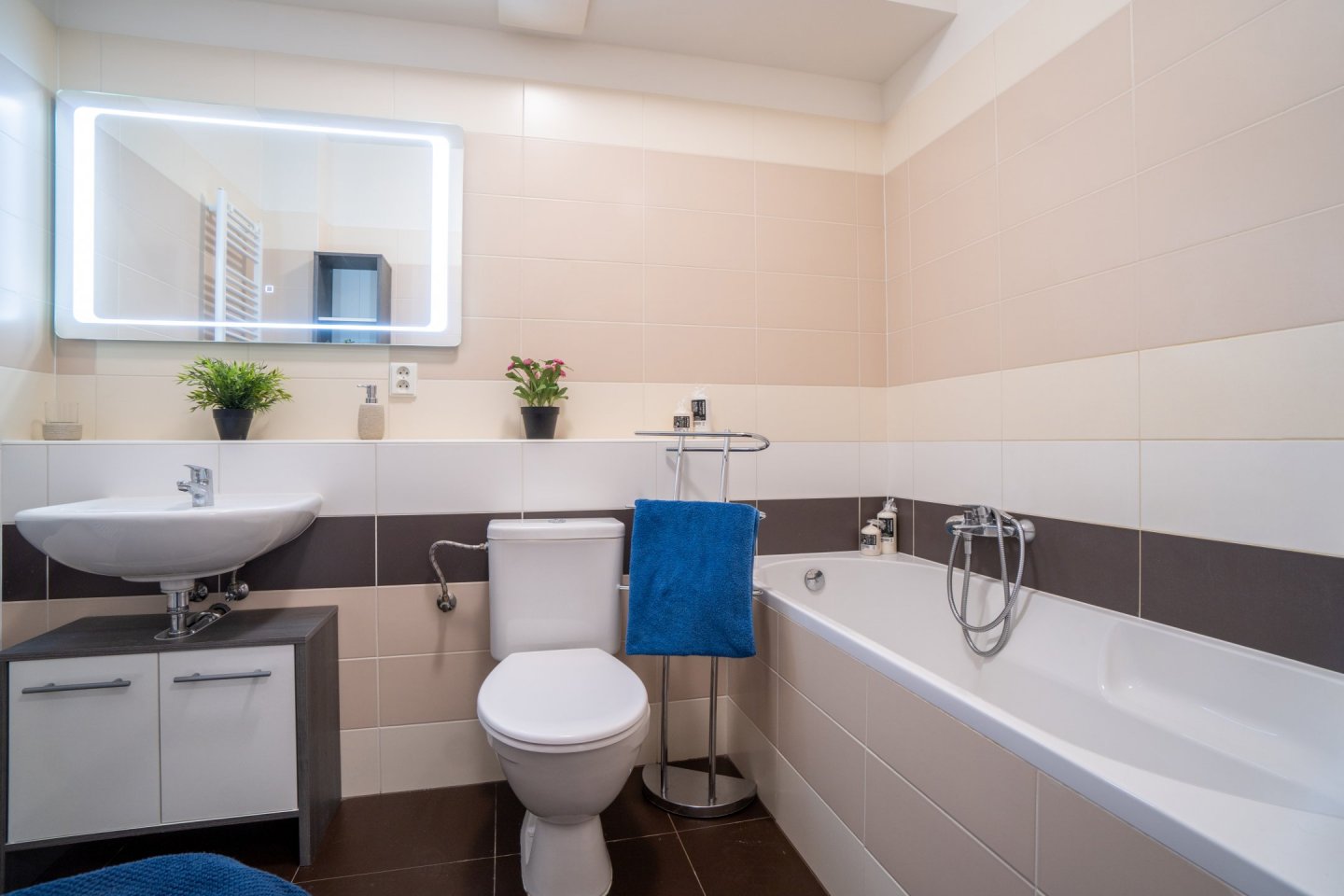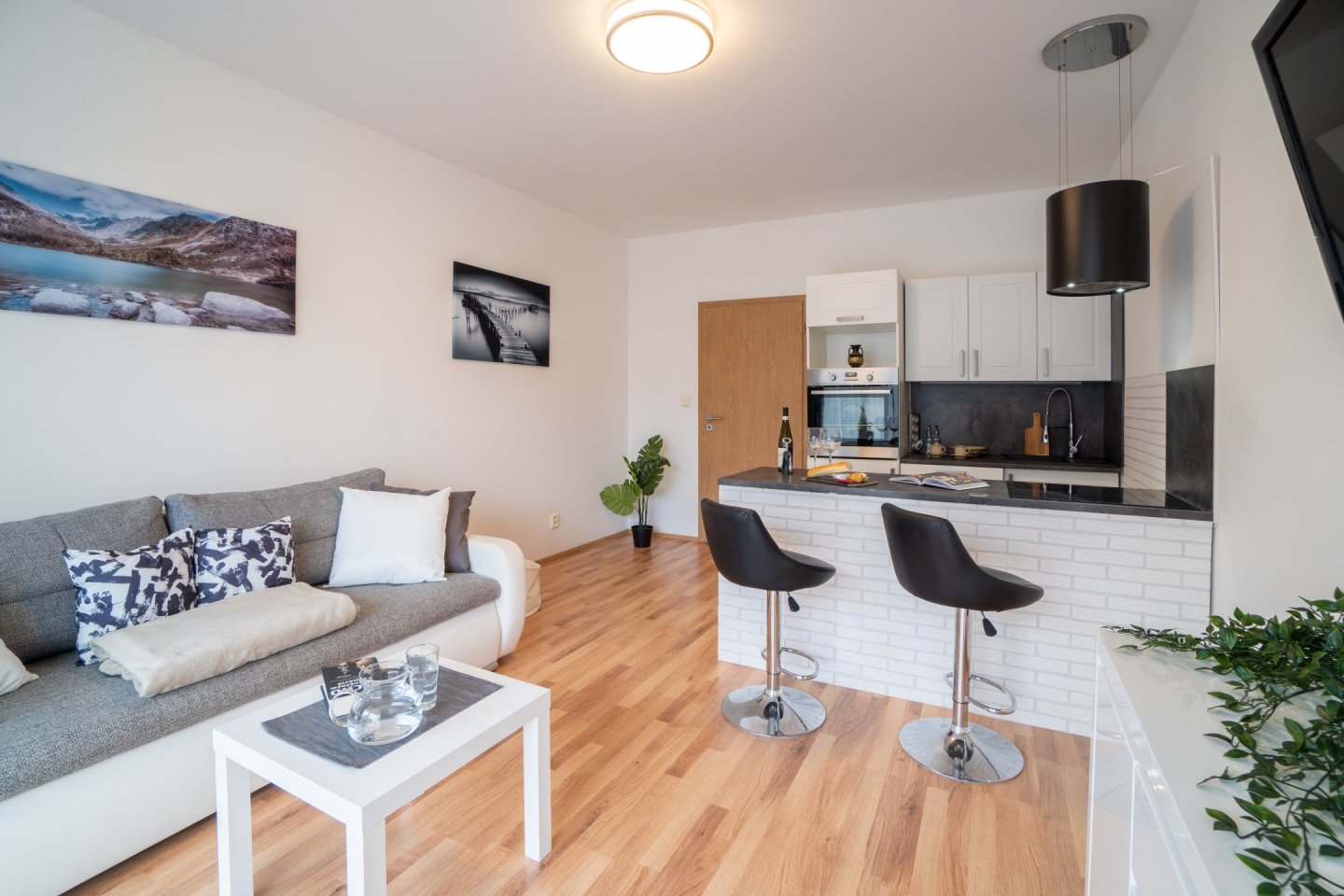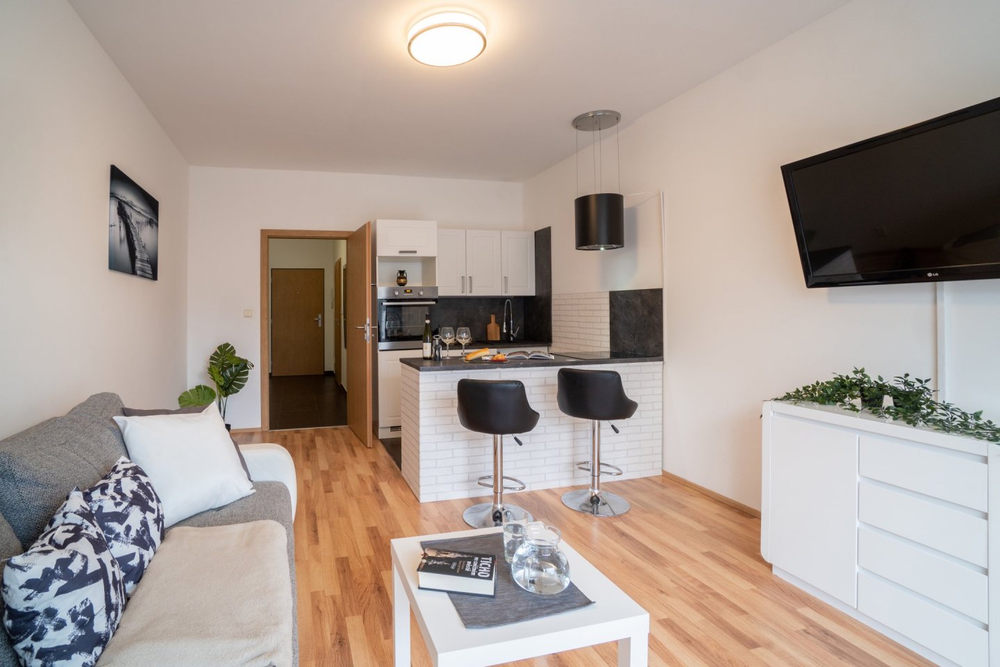 Obývací pokoj je spojený s kuchyňským koutem o celkové rozloze 20,5 m2, kuchyně je oddělena praktickým pultem s dvěma židlemi a možností využití jako jídelního stolu. V Kuchyni je pak myčka, horkovzdušná trouba, indukční varná deska se čtyřmi plotýnkami a digestoř. Podlahovou krytinu tvoří plovoucí podlaha. V obývacím pokoji rozkládací pohovka, komoda a TV, topení řešeno lokální ústředním kotelnou v domě. Z obývacího pokoje je přístup na menší zahrádku o velikosti cca 20 m2, která je vybavena zahradním nábytkem k příjemnému ničím nerušenému posezení až čtyř osob se stolkem a dvěma úložnými skříňkami. Plot s neprůhlednou plachtou pro zachování max. soukromí vůči klidné postranní uličce.