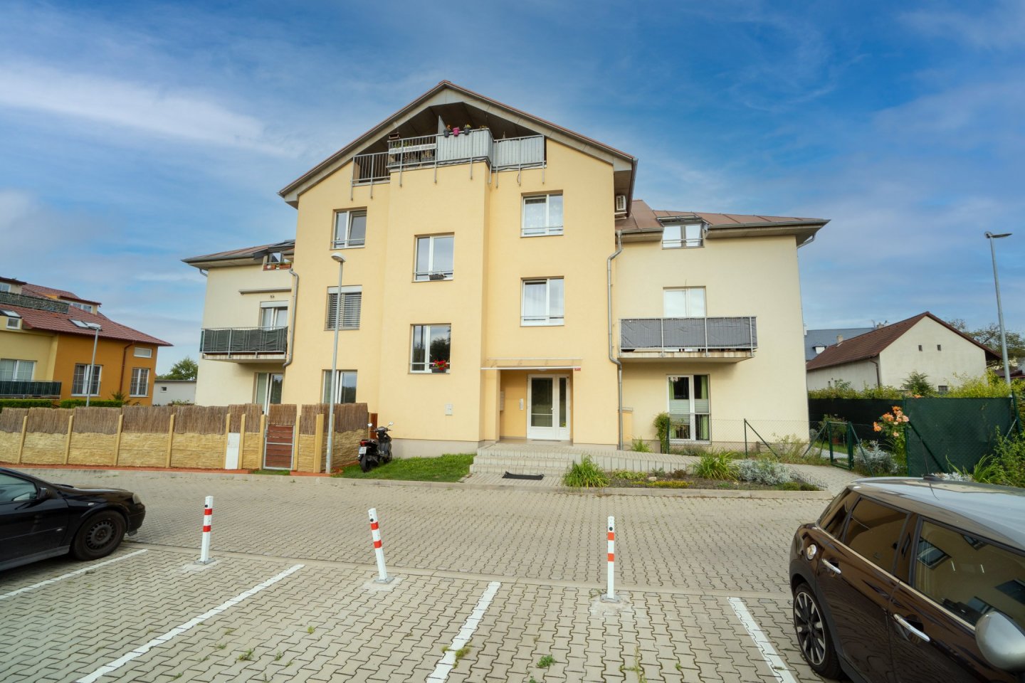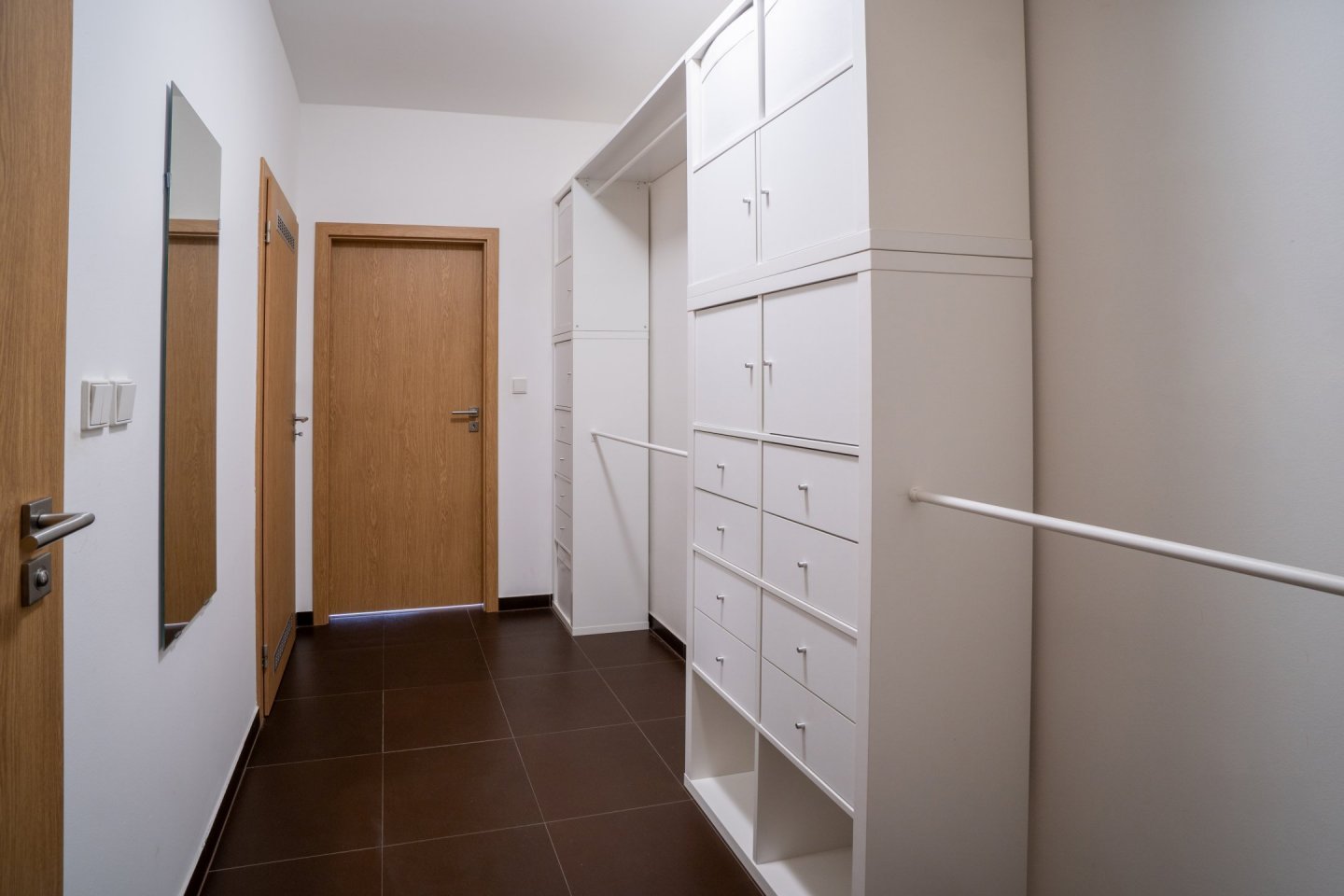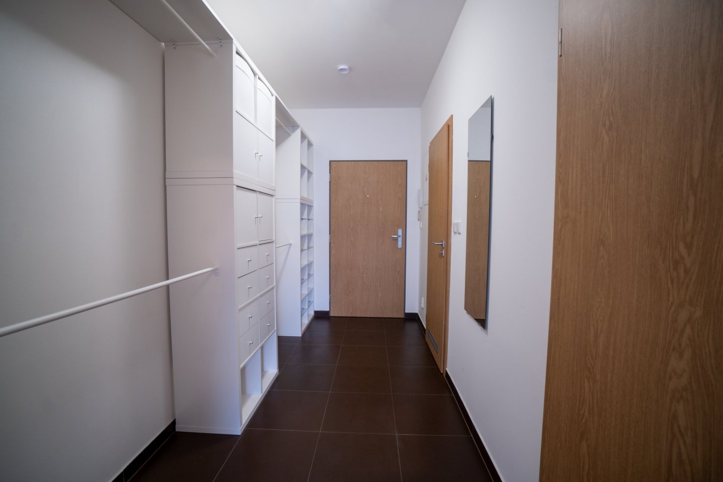 Byt je ideální pro jednu osobu a nachází se v přízemí novostavby s bezbariérovým přístupem. Předsíň vybavena velkou vestavěnou skříní s dostatečným úložným prostorem, včetně oddělené technické komory pro pračku (případně sušičku) a lednici, dále je z ní přístup do koupelny s vanou a WC. Podlahovou krytinu tvoří dlažba.