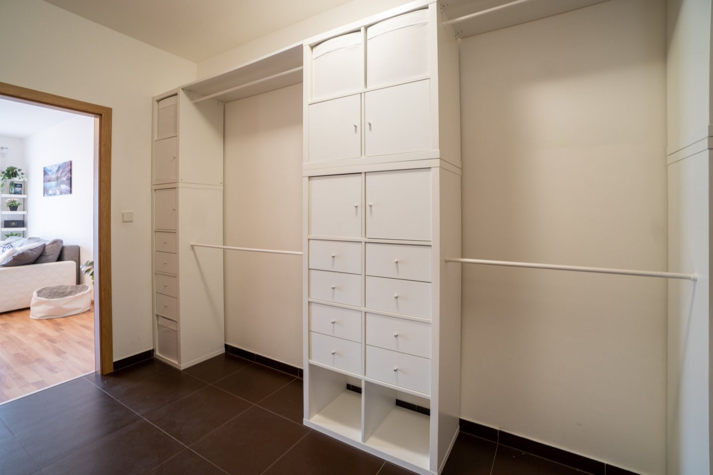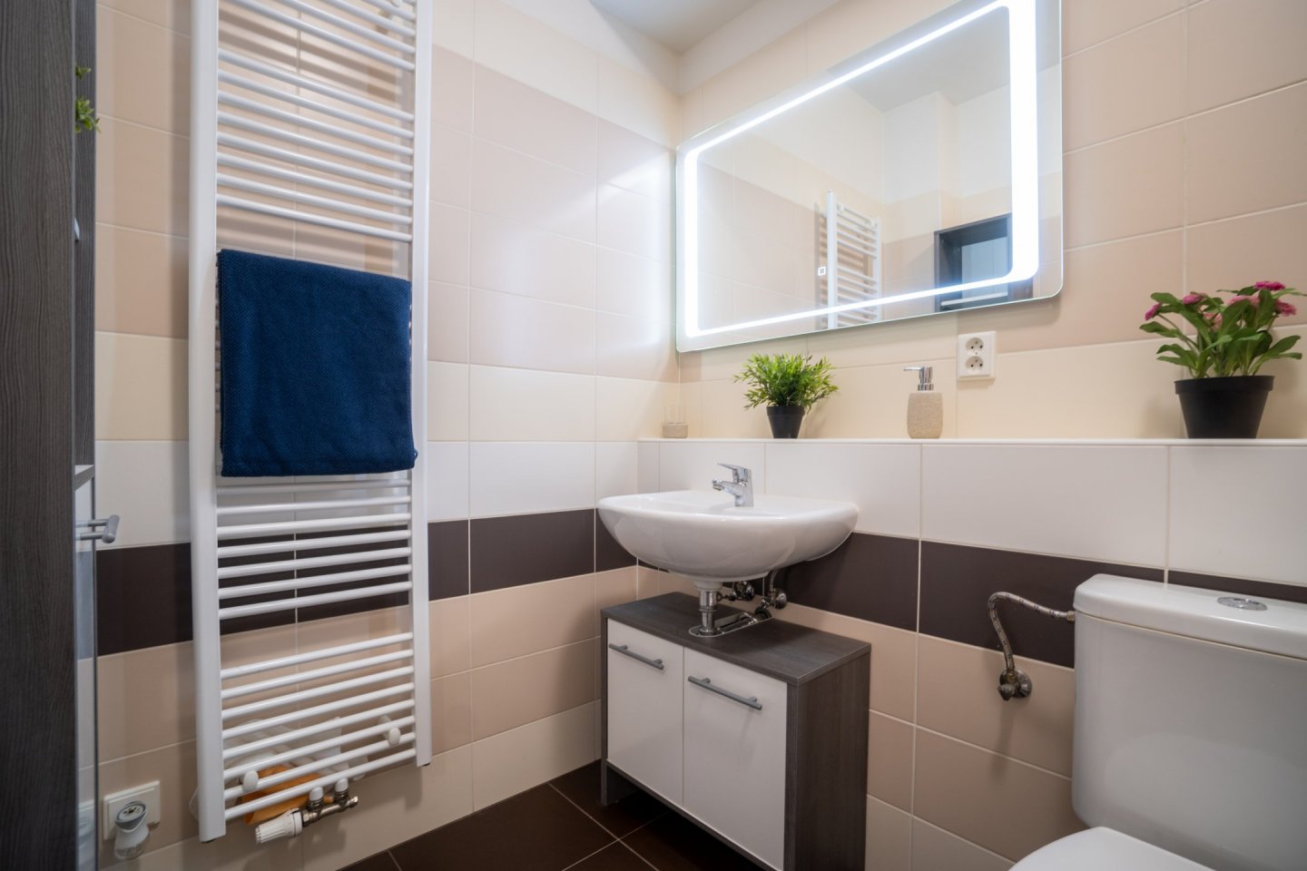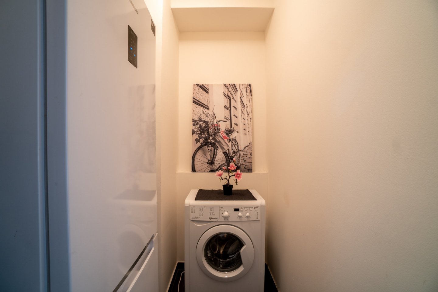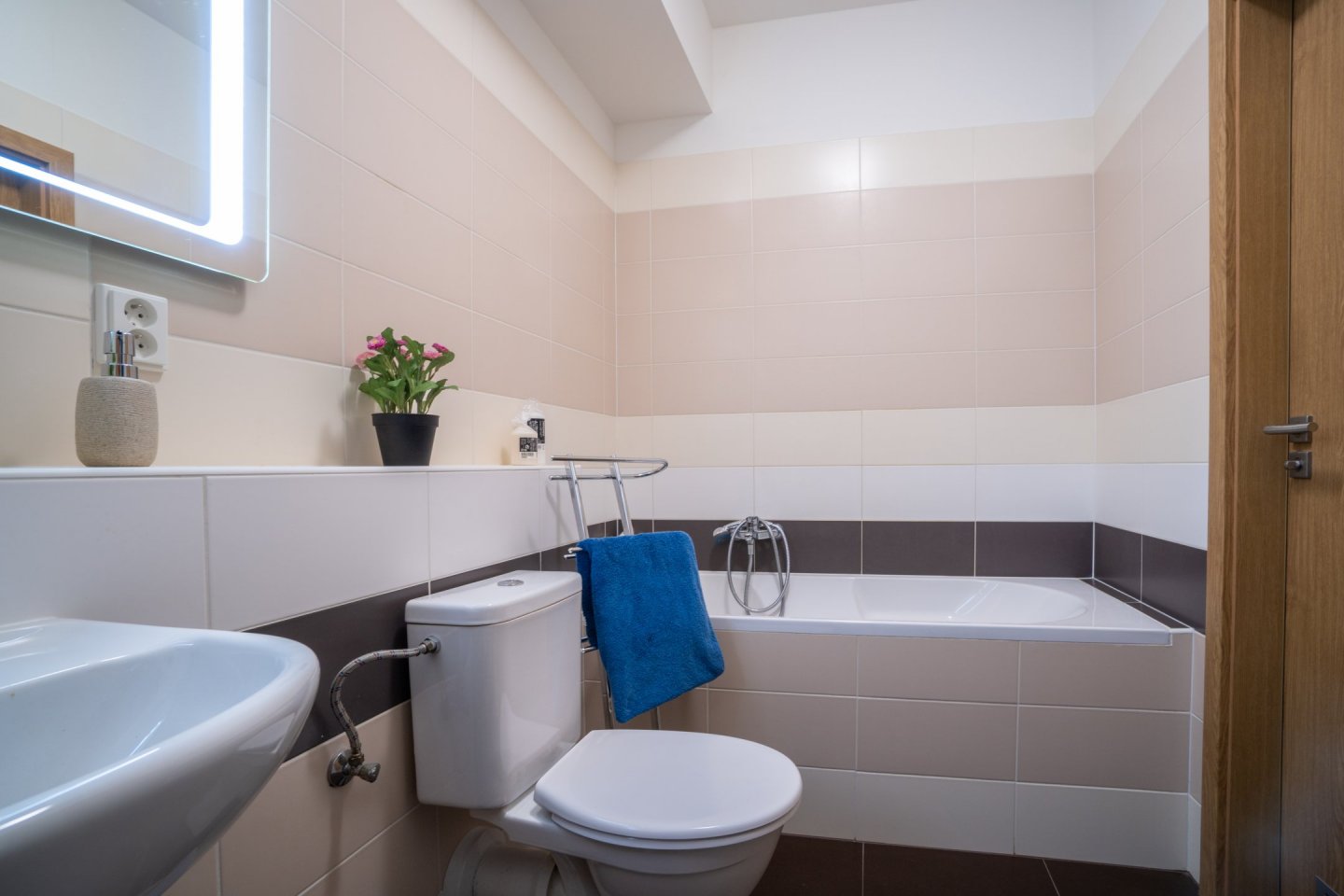 Byt je ideální pro jednu osobu a nachází se v přízemí novostavby s bezbariérovým přístupem. Předsíň vybavena velkou vestavěnou skříní s dostatečným úložným prostorem, včetně oddělené technické komory pro pračku (případně sušičku) a lednici, dále je z ní přístup do koupelny s vanou a WC. Podlahovou krytinu tvoří dlažba.