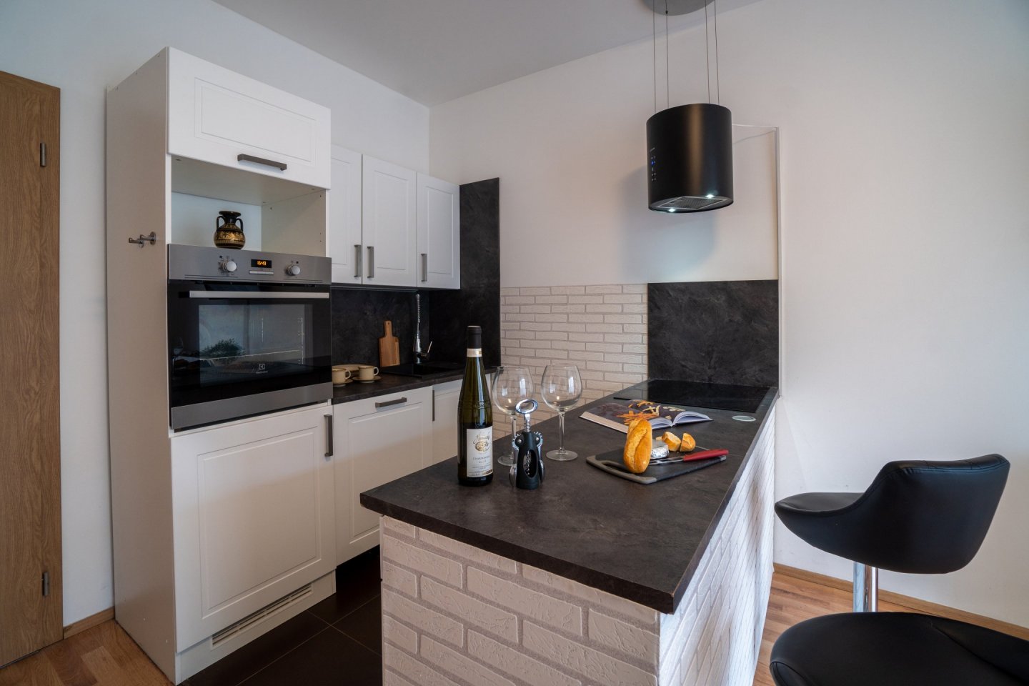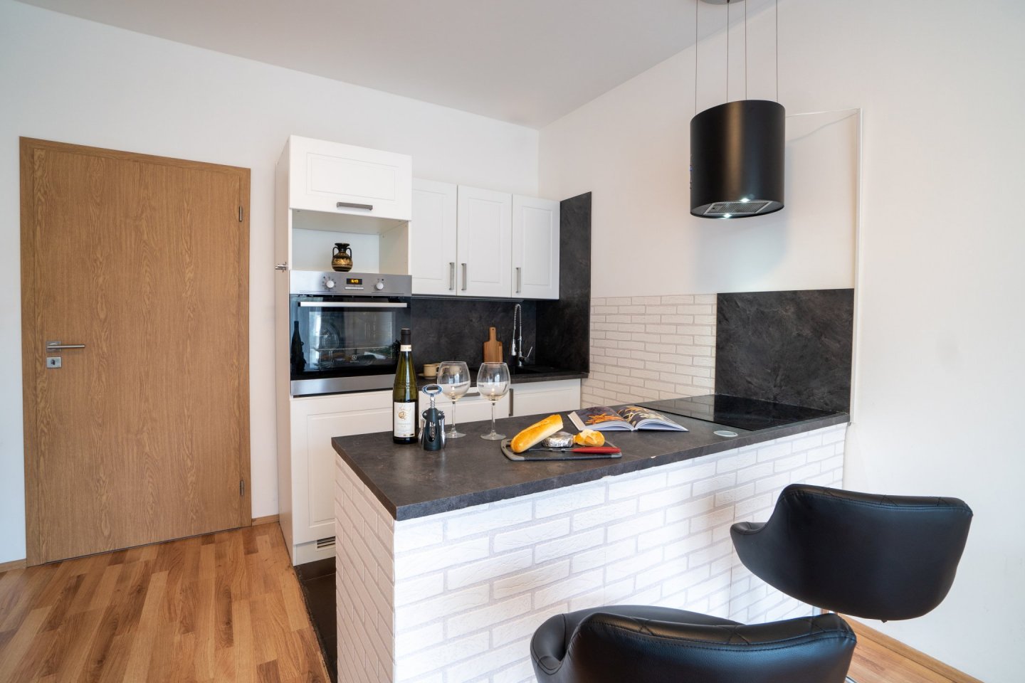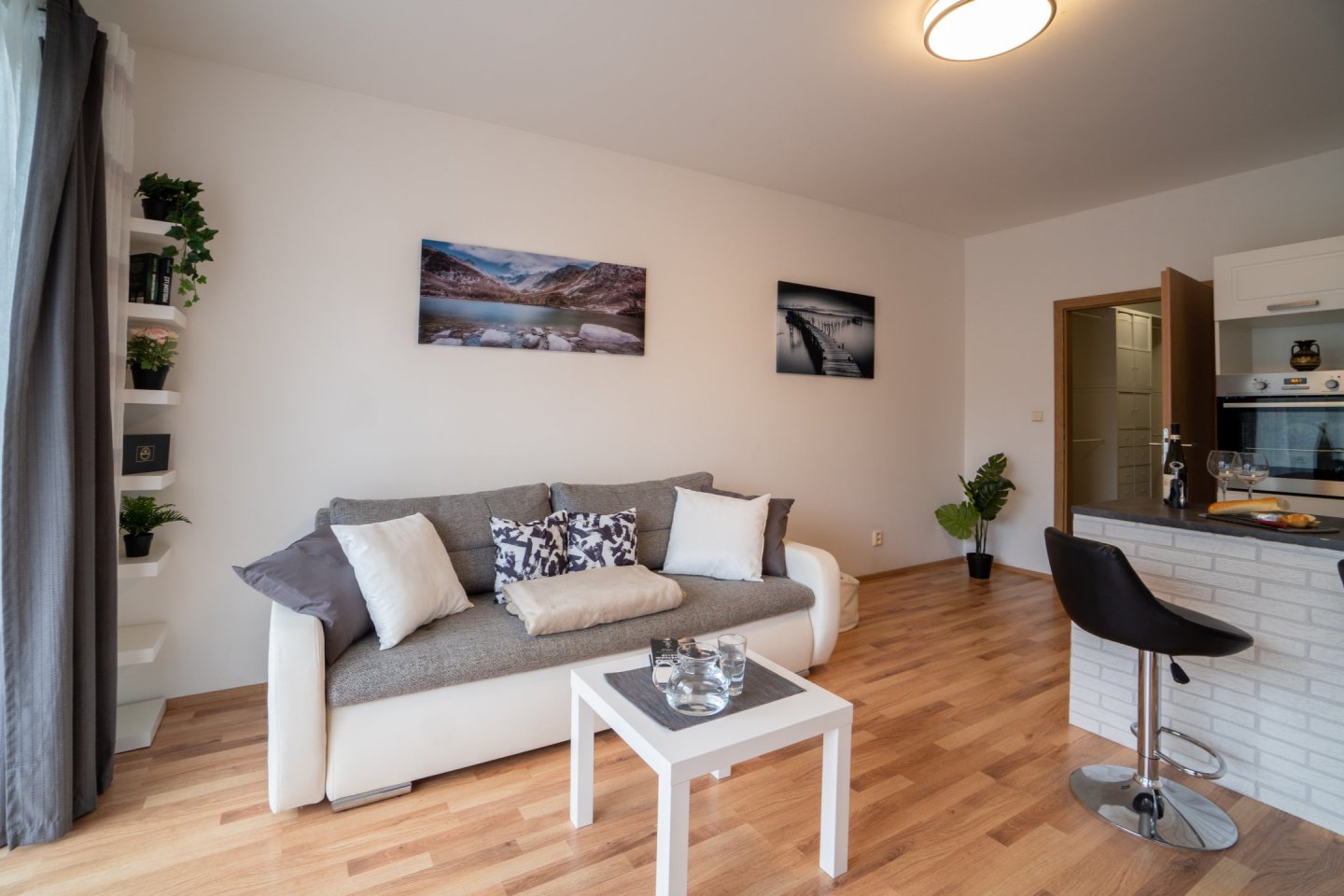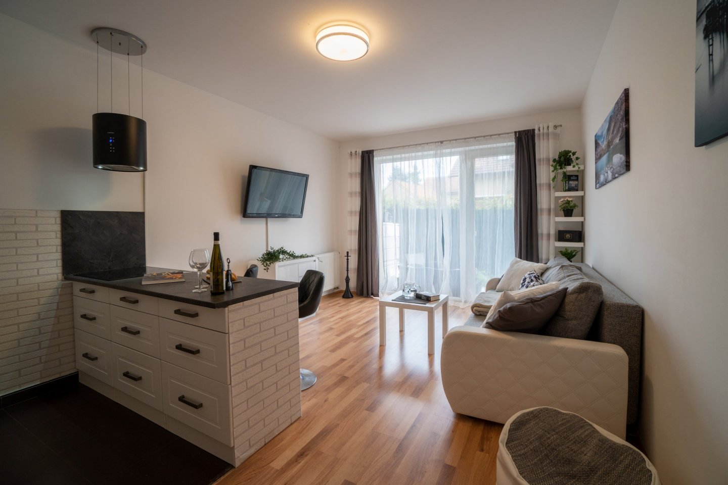 Obývací pokoj je spojený s kuchyňským koutem o celkové rozloze 20,5 m2, kuchyně je oddělena praktickým pultem s dvěma židlemi a možností využití jako jídelního stolu. V Kuchyni je pak myčka, horkovzdušná trouba, indukční varná deska se čtyřmi plotýnkami a digestoř. Podlahovou krytinu tvoří plovoucí podlaha. V obývacím pokoji rozkládací pohovka, komoda a TV, topení řešeno lokální ústředním kotelnou v domě. Z obývacího pokoje je přístup na menší zahrádku o velikosti cca 20 m2, která je vybavena zahradním nábytkem k příjemnému ničím nerušenému posezení až čtyř osob se stolkem. Plot s neprůhlednou plachtou pro zachování max. soukromí vůči klidné postranní uličce.