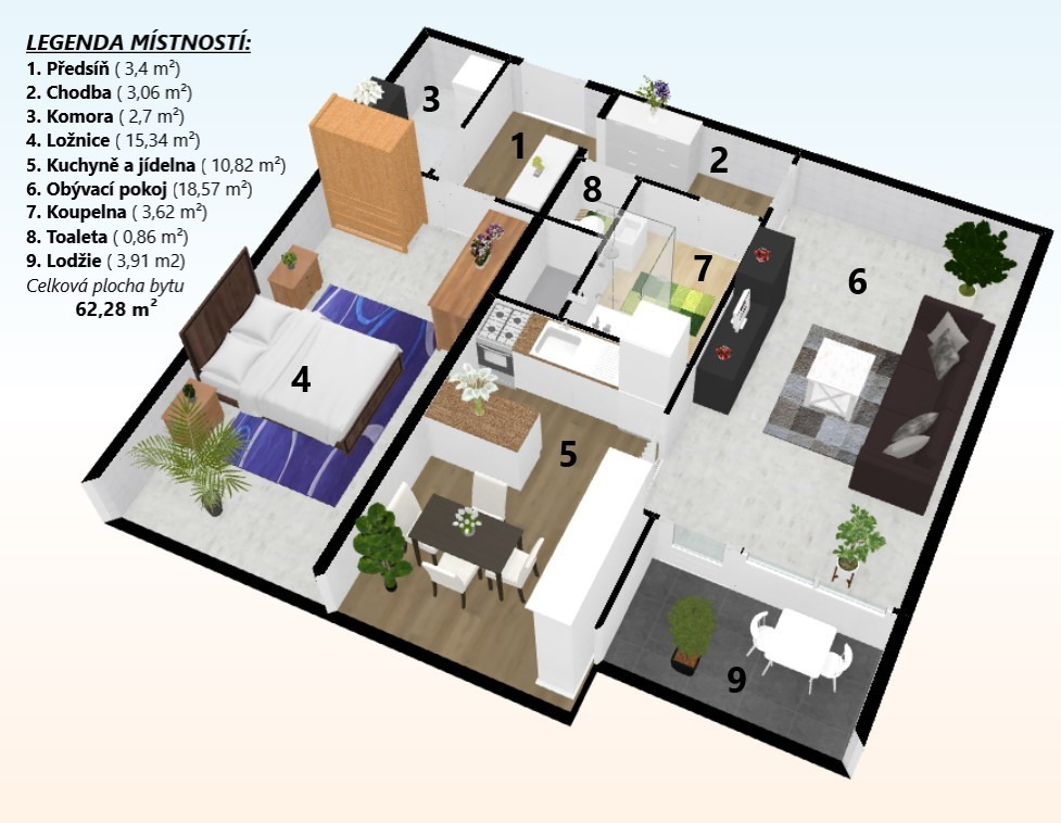 Dovolujeme si Vám nabídnout k pronájmu velmi zajímavý zrekonstruovaný byt 2+1 o podlahové ploše 62,5 m2 v ul. Hrubého, Praha 8 – Kobylisy. Součástí bytu je komora a lodžie se 2 křesly. Byt se nabízí nezařízení, krom vybavení uvedeného v popisu, zbylé vybavení na fotografiích je pouze ilustrační). Celý byt si můžete, ještě před samotnou osobní prohlídkou, projít pomocí virtuální prohlídky zde: https://my.matterport.com/show/?m=sE1sPA3afFf.