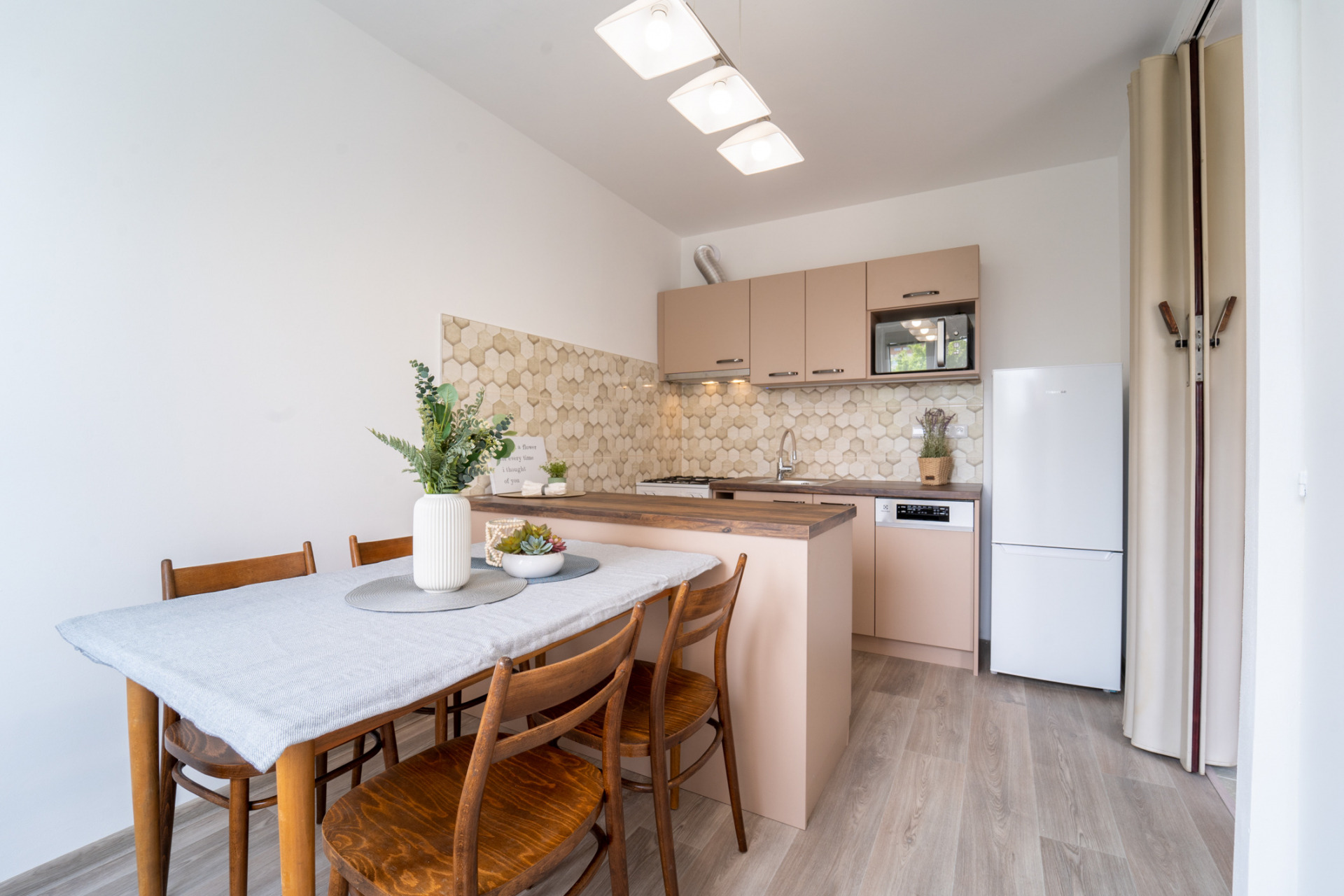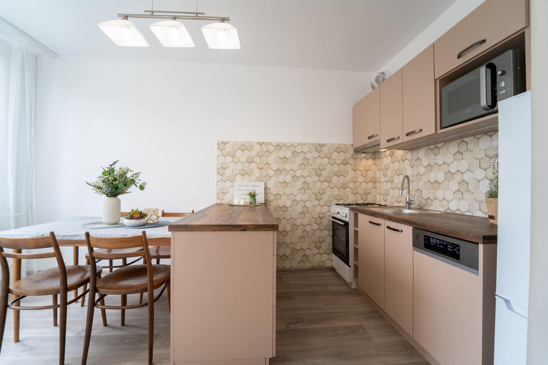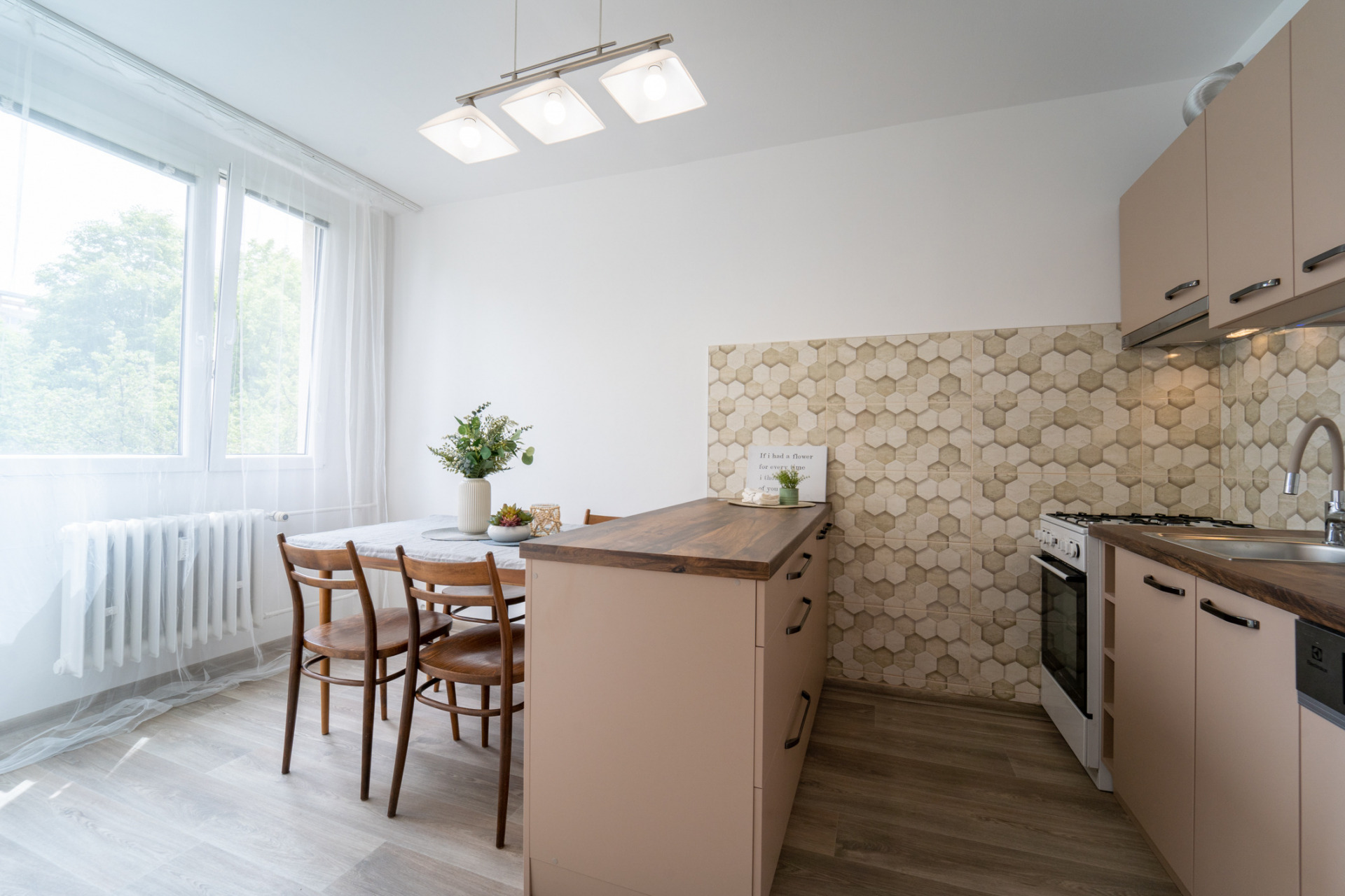 V bytě pak nová koupelna se sprchovým koutem, WC samostatně, nový rozvaděč, nová kuchyňská linka se spotřebiči (plynový sporák s elektrickou troubou, mikrovlnná trouba, myčka a lednice s mrazákem), stůl + 4 židle, vestavěné skříně, na podlahách (vinyl, lino a dlažba). Topení dálkové ústřední.