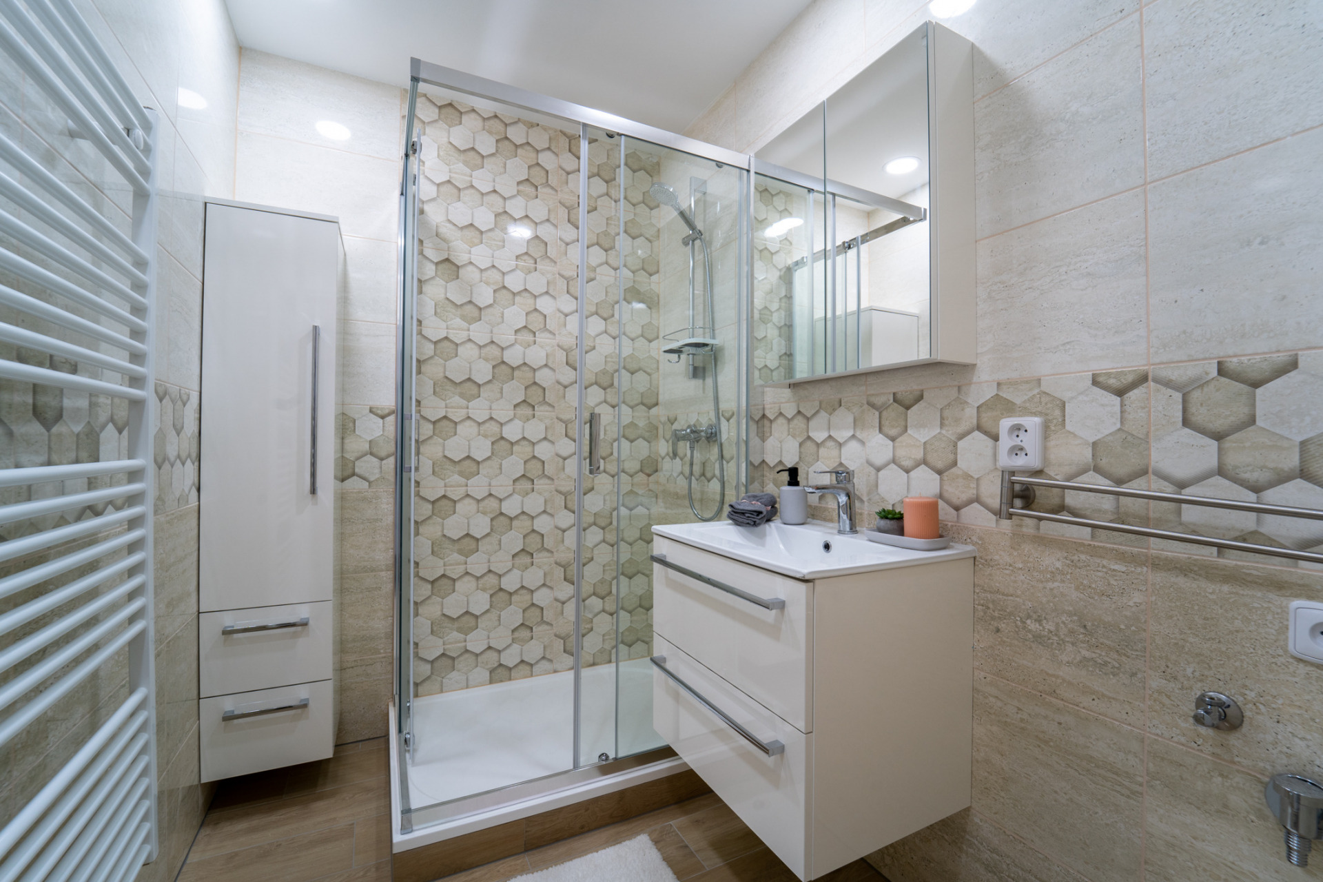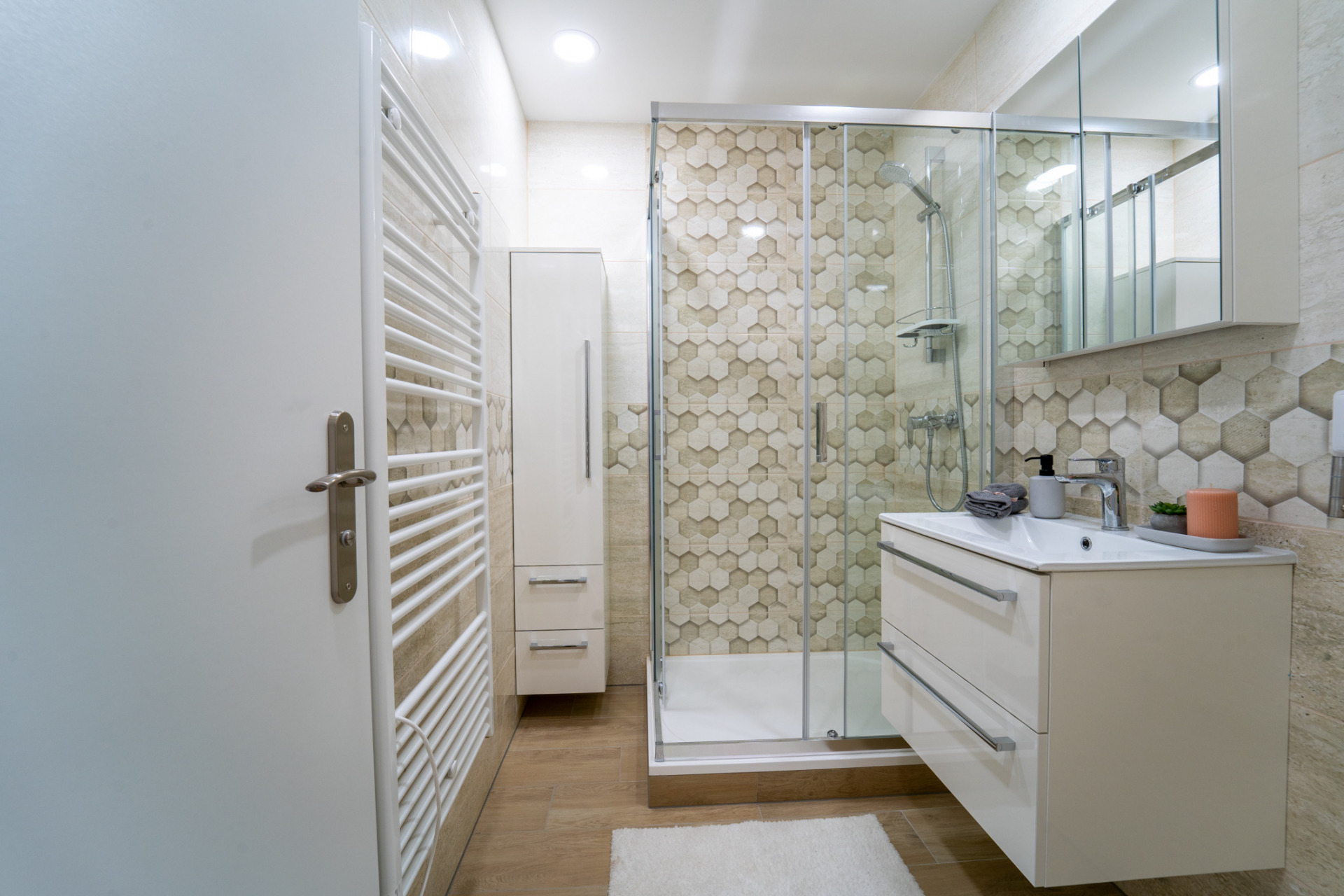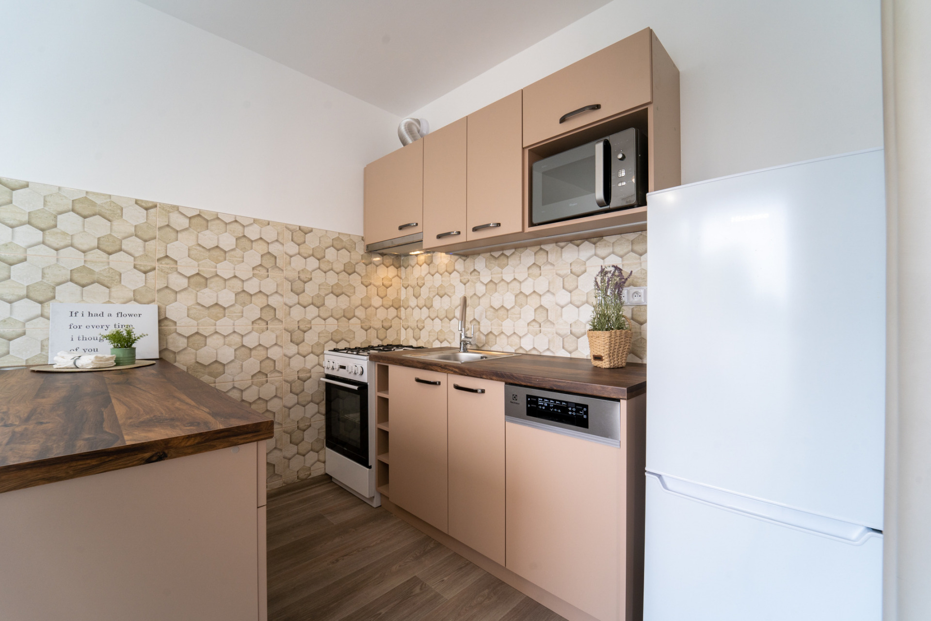 V bytě pak nová koupelna se sprchovým koutem, WC samostatně, nový rozvaděč, nová kuchyňská linka se spotřebiči (plynový sporák s elektrickou troubou, mikrovlnná trouba, myčka a lednice s mrazákem), stůl + 4 židle, vestavěné skříně, na podlahách (vinyl, lino a dlažba). Topení dálkové ústřední.