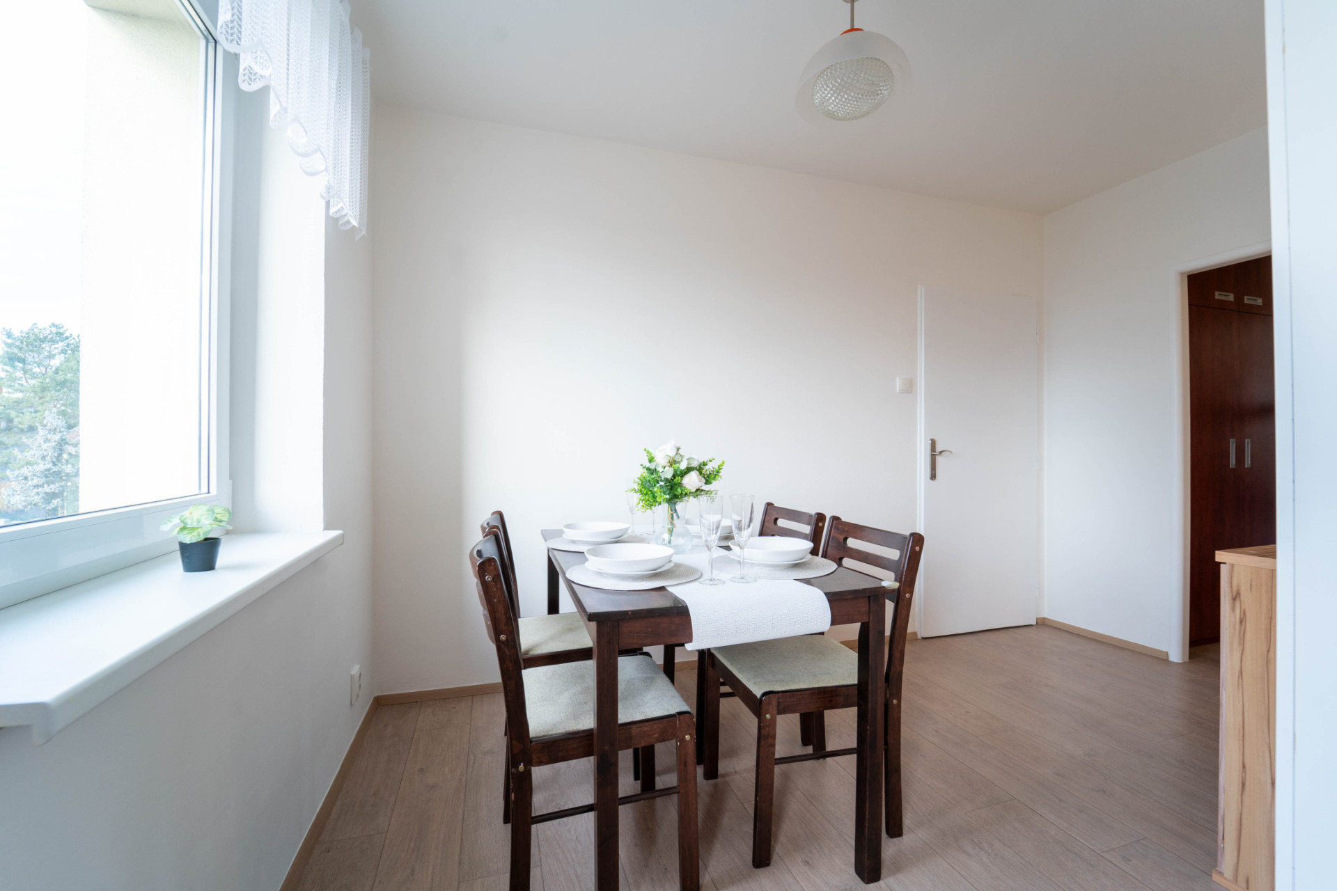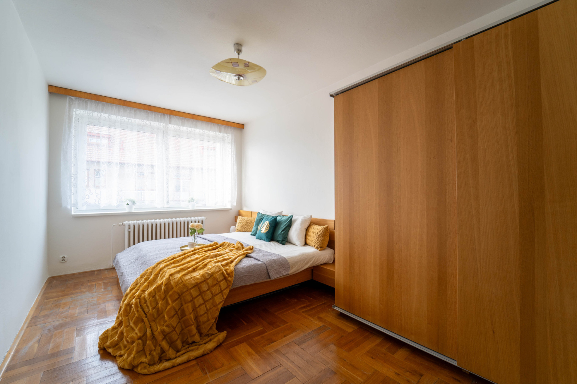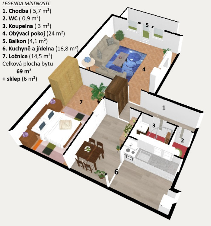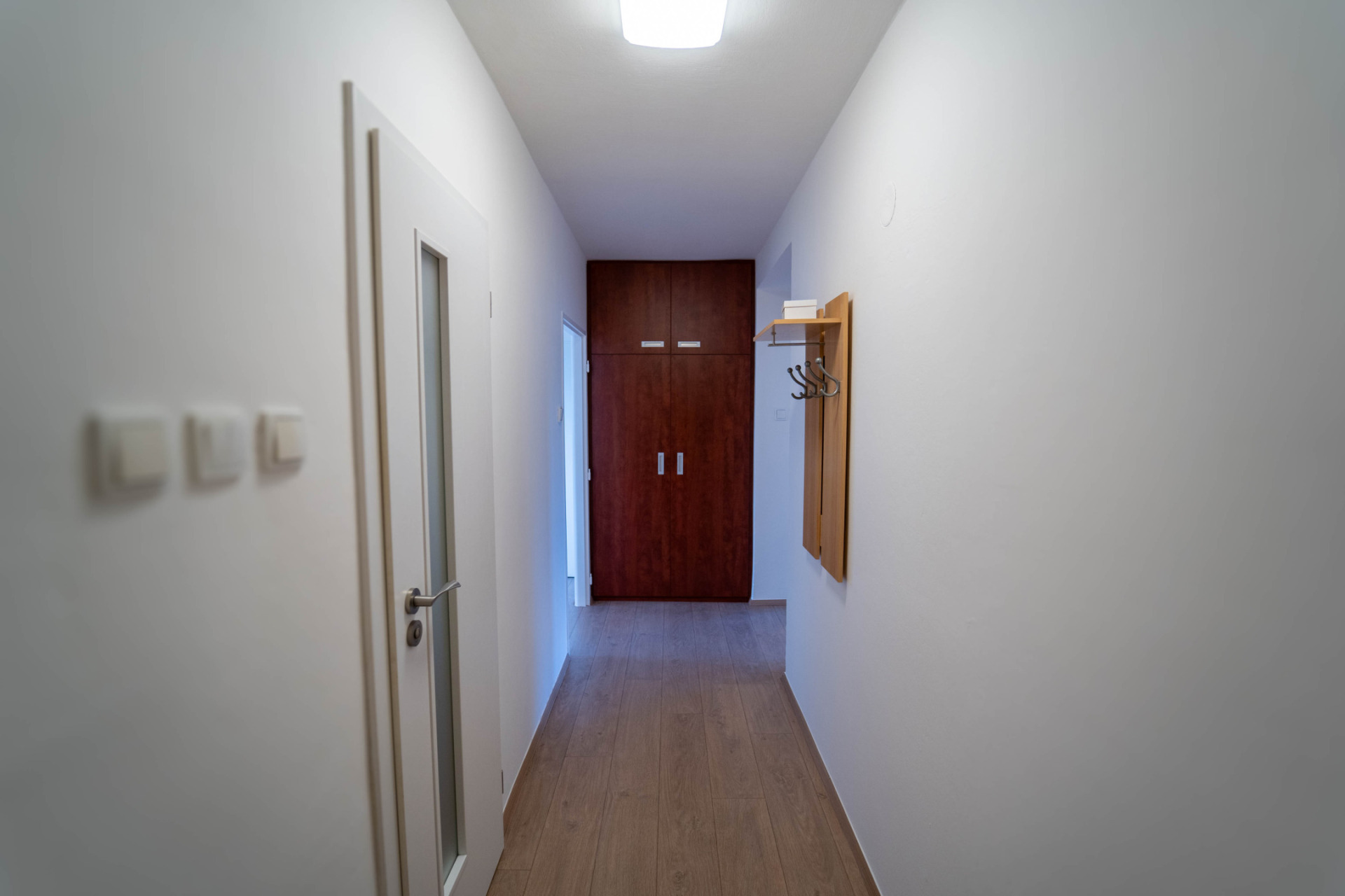 Dispozice bytu: Koupelna se sprchovým koutem, umyvadlem se šuplíky, skříňkou a pračkou, WC samostatně, , kuchyňská linka se spotřebiči (plynový sporák s elektrickou troubou, digestoř a lednice s mrazákem, poté jídelní stůl se 4 židlemi a komoda. V Ložnici možnost ponechání manželské postele s rošty, nočních stolků a větší skříně za úplatu, případně bude odstěhováno, v chodbě pak vestavěná skříň a v obývací pokoji TV stěna a další komoda.