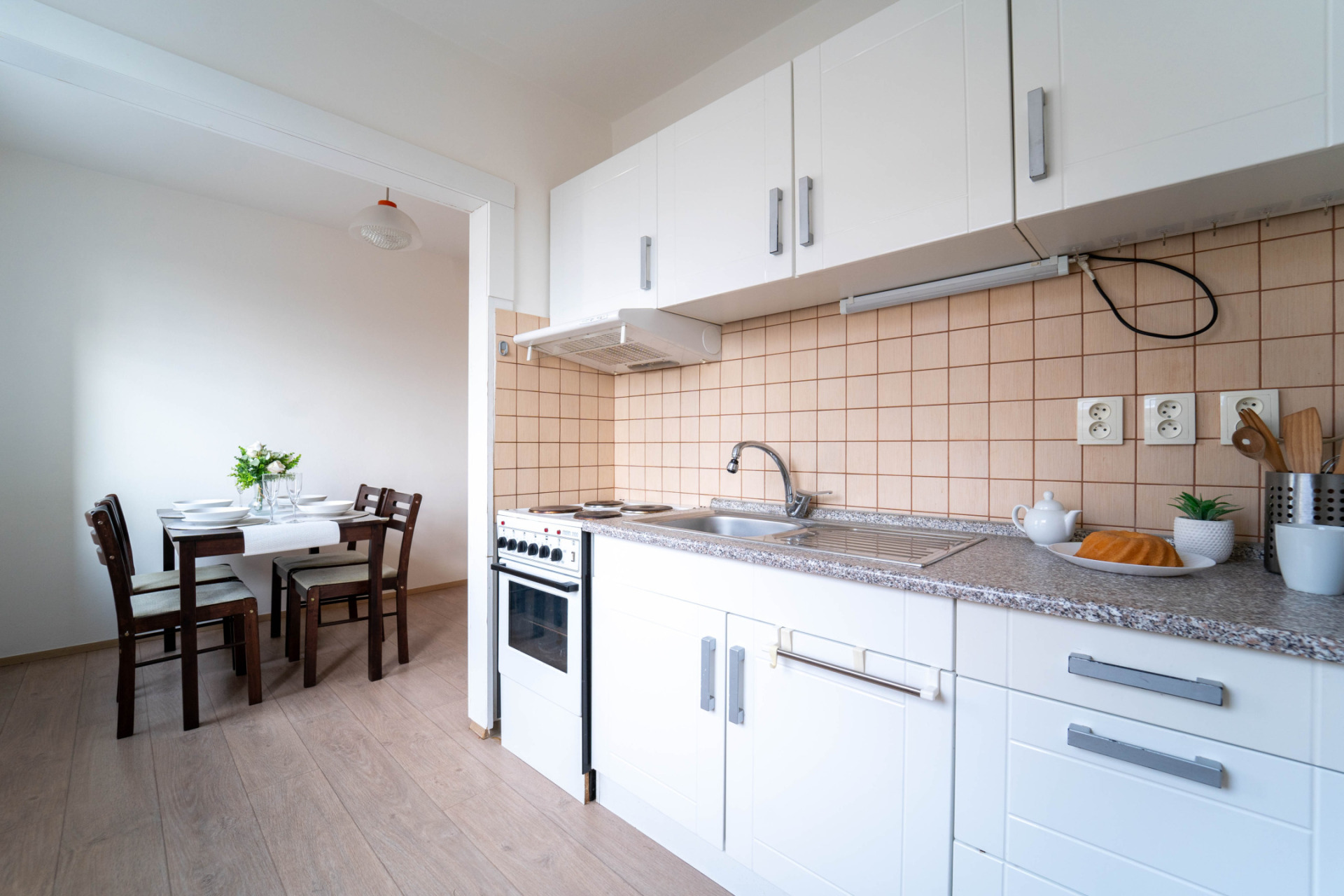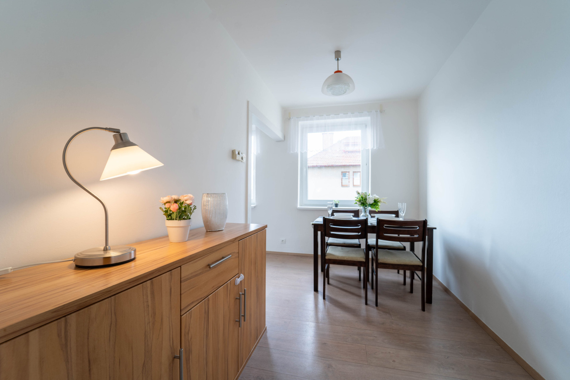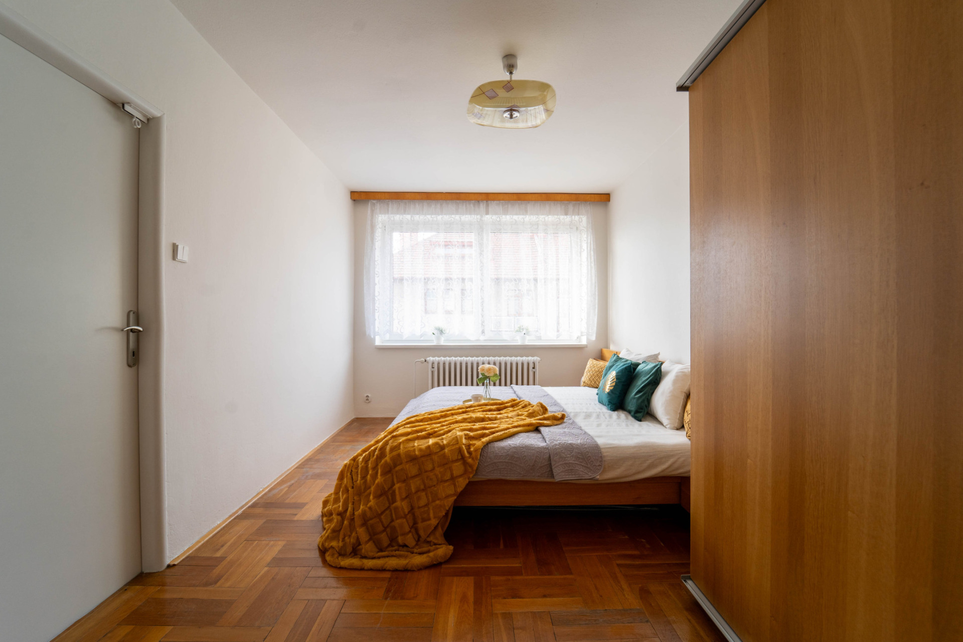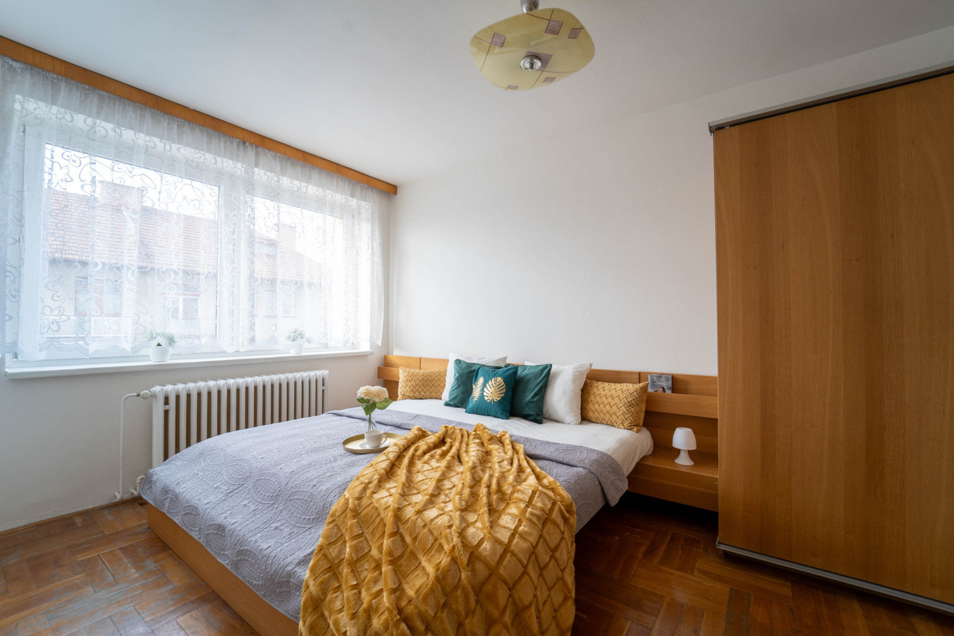 Dispozice bytu: Koupelna se sprchovým koutem, umyvadlem se šuplíky, skříňkou a pračkou, WC samostatně, , kuchyňská linka se spotřebiči (plynový sporák s elektrickou troubou, digestoř a lednice s mrazákem, poté jídelní stůl se 4 židlemi a komoda. V Ložnici možnost ponechání manželské postele s rošty, nočních stolků a větší skříně za úplatu, případně bude odstěhováno, v chodbě pak vestavěná skříň a v obývací pokoji TV stěna a další komoda.