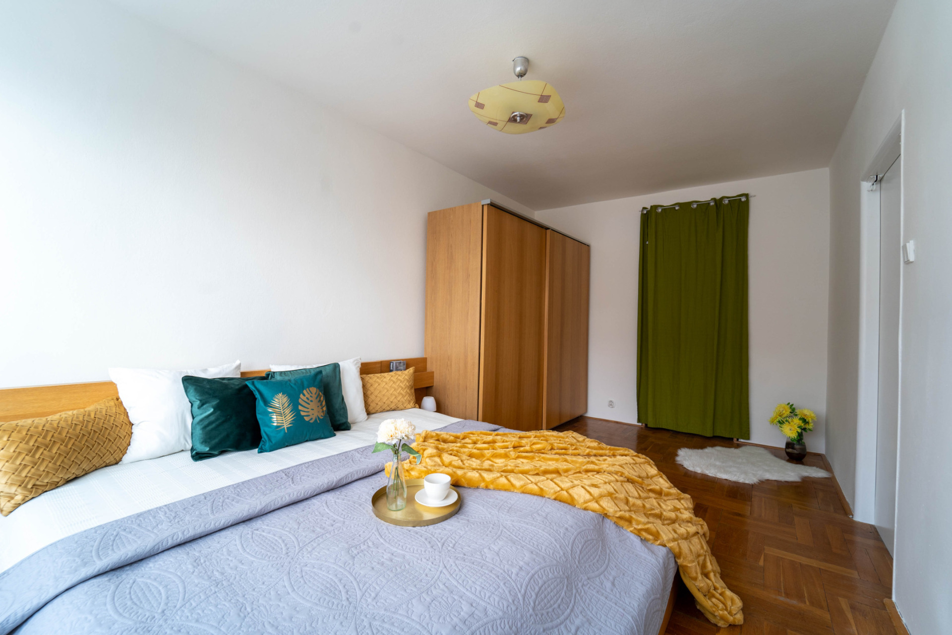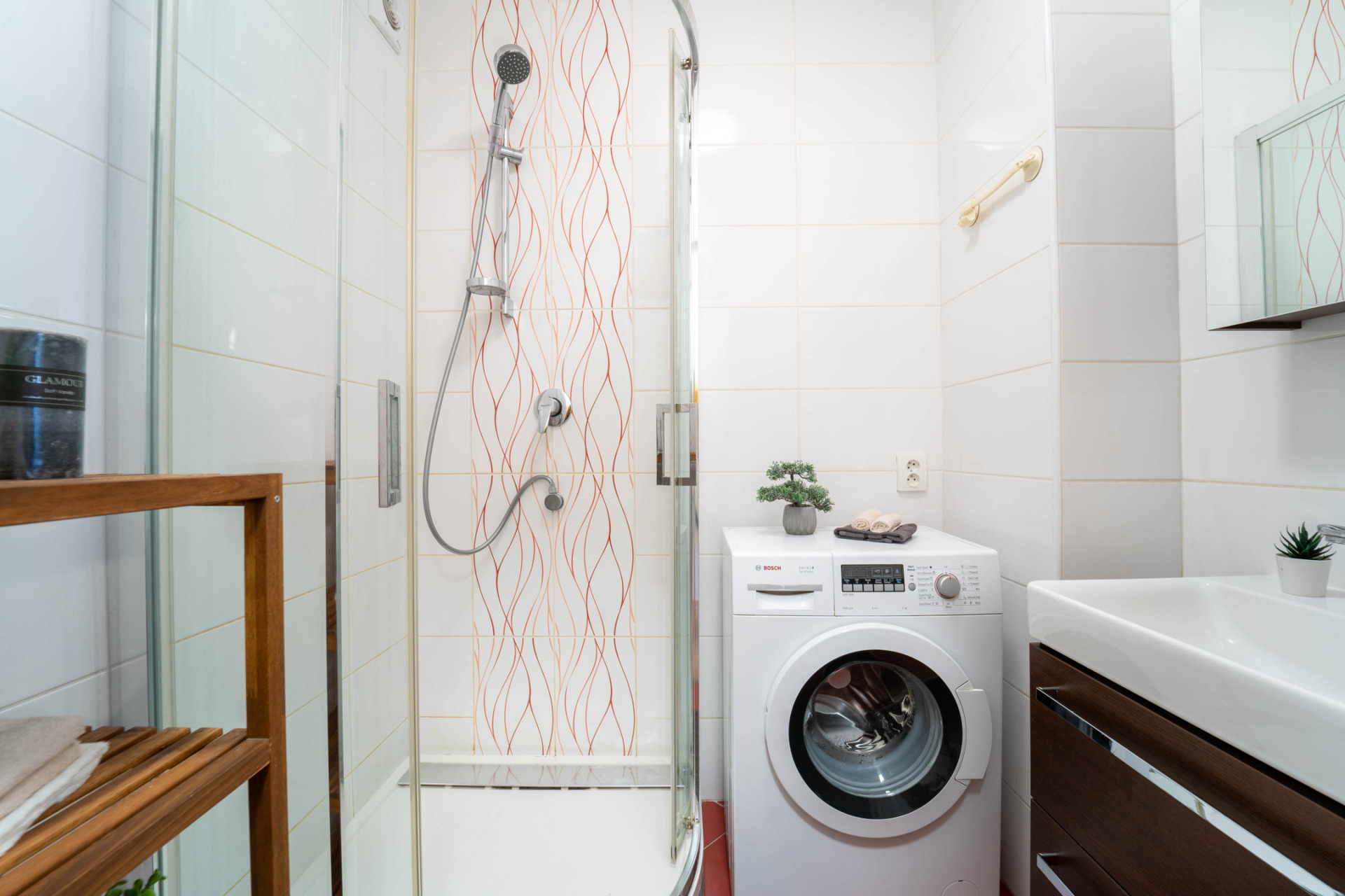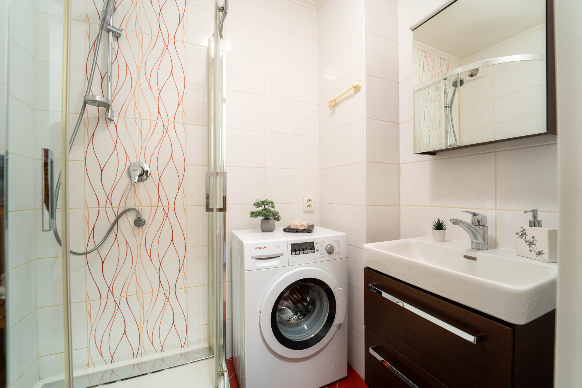 Dispozice bytu: Koupelna se sprchovým koutem, umyvadlem se šuplíky, skříňkou a pračkou, WC samostatně, , kuchyňská linka se spotřebiči (plynový sporák s elektrickou troubou, digestoř a lednice s mrazákem, poté jídelní stůl se 4 židlemi a komoda. V Ložnici možnost ponechání manželské postele s rošty, nočních stolků a větší skříně za úplatu, případně bude odstěhováno, v chodbě pak vestavěná skříň a v obývací pokoji TV stěna a další komoda.
