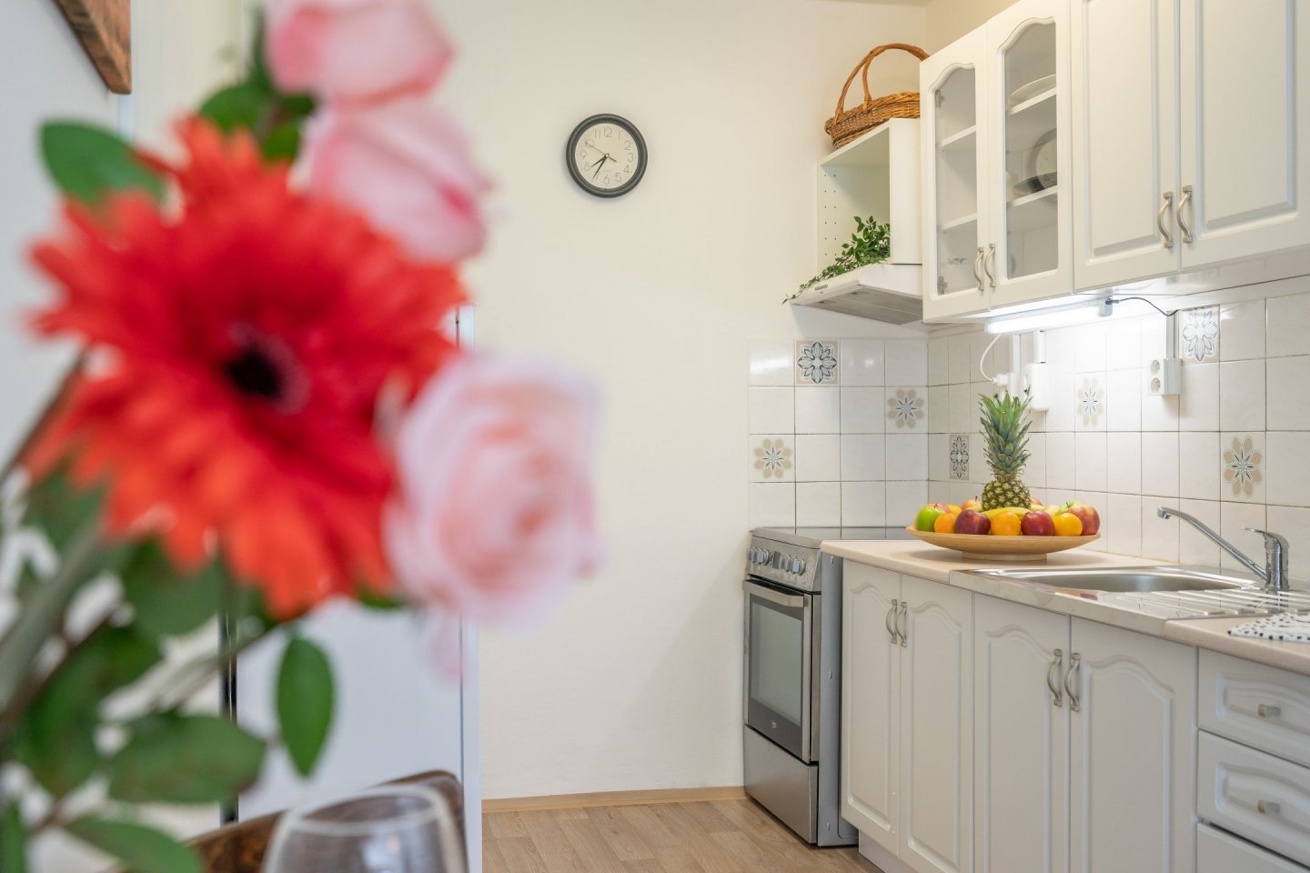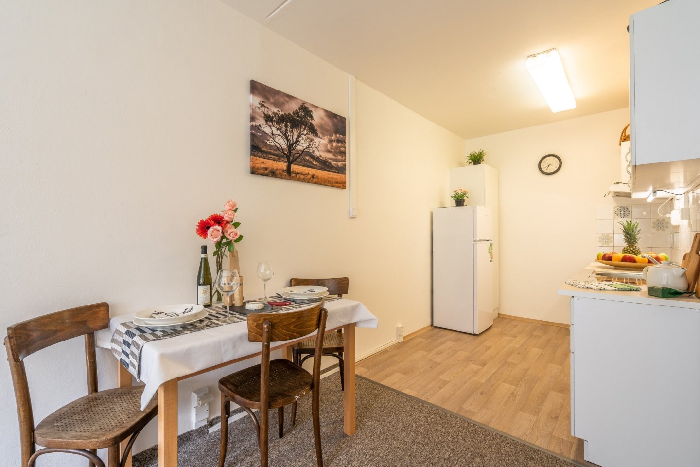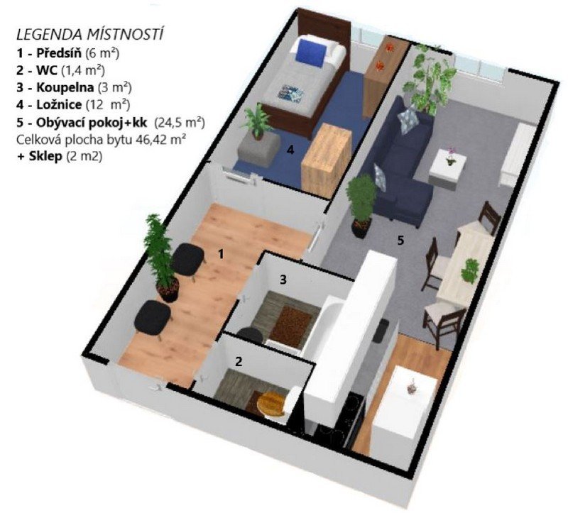 Vybavení, které je součástí bytu: kuchyňská linka s elektrickou troubou a varnou deskou, lednice, jídelní stůl, tři židle, pohovka, konferenční stolek, v ložnici skříň, postel a komoda, v předsíni botník a zrcadlo. (ostatní vybavení je pouze prezentační)